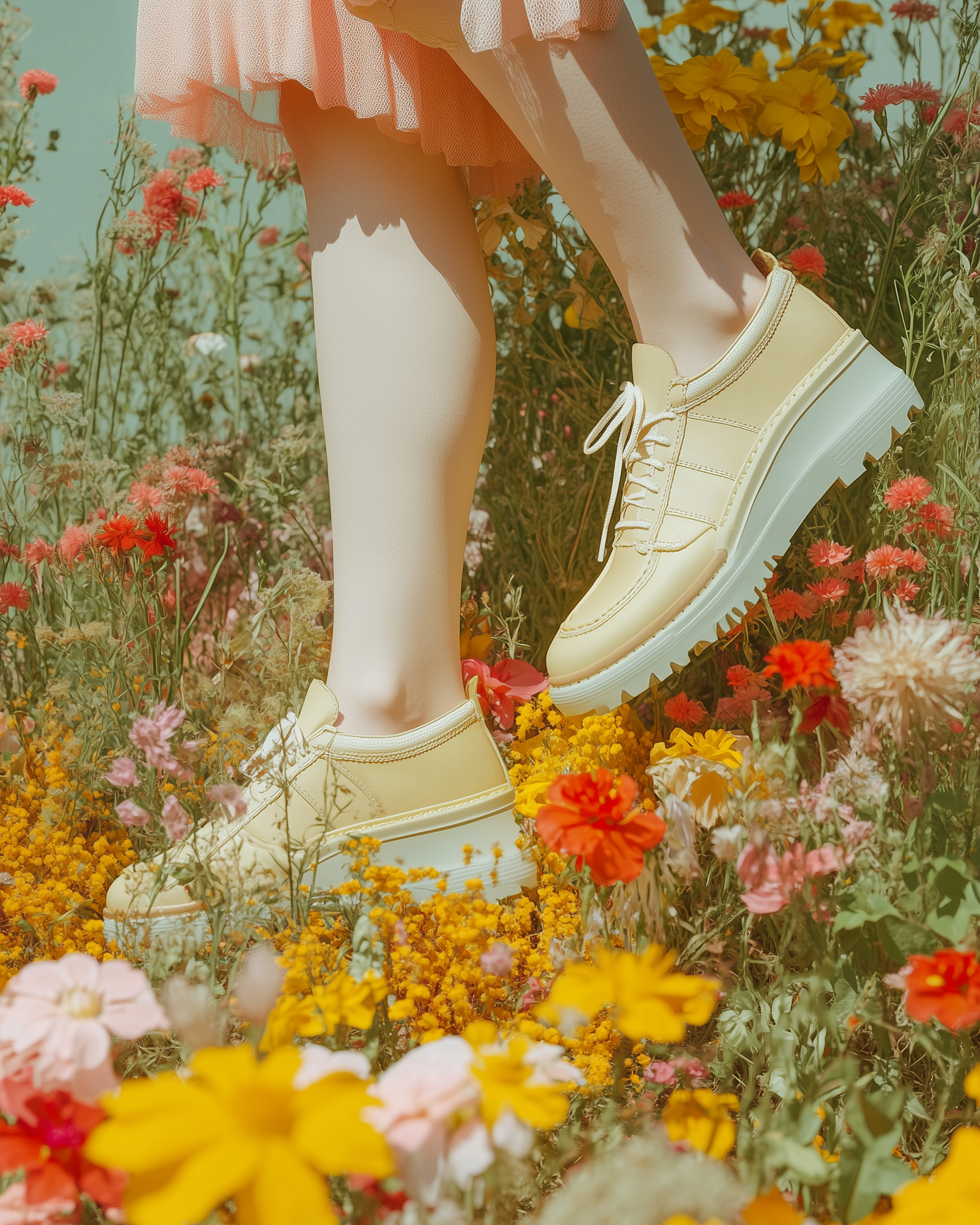 Stylish yellow shoes with white laces in a vibrant flower field, paired with a pink skirt. Bright and colorful spring scene.