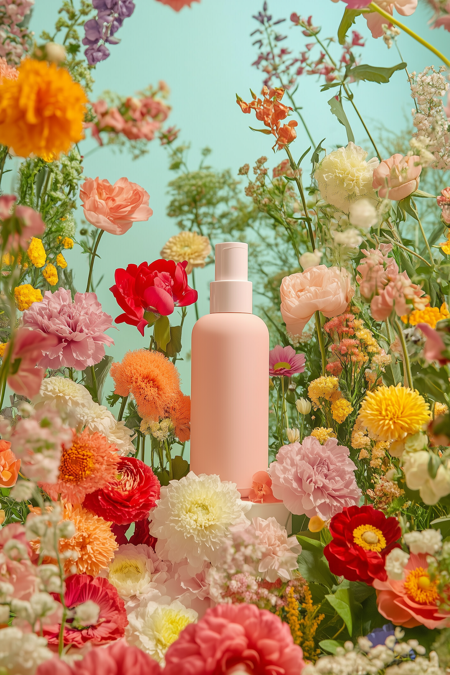 A pastel pink spray bottle surrounded by vibrant flowers in red, yellow, and pink hues, set against a soft turquoise background.