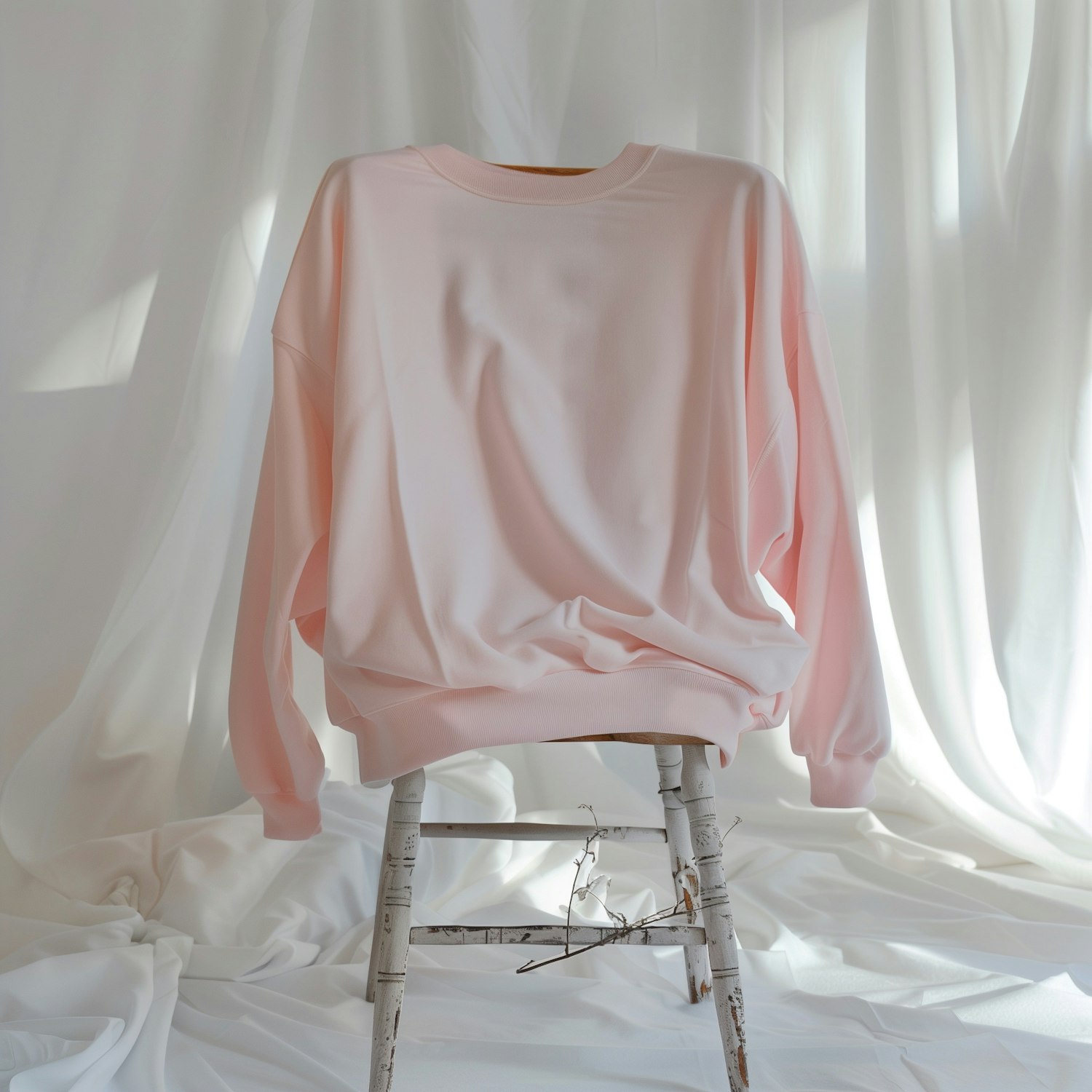 Soft pastel pink sweatshirt draped over a vintage white chair, set against flowing white fabric with natural light and gentle shadows.