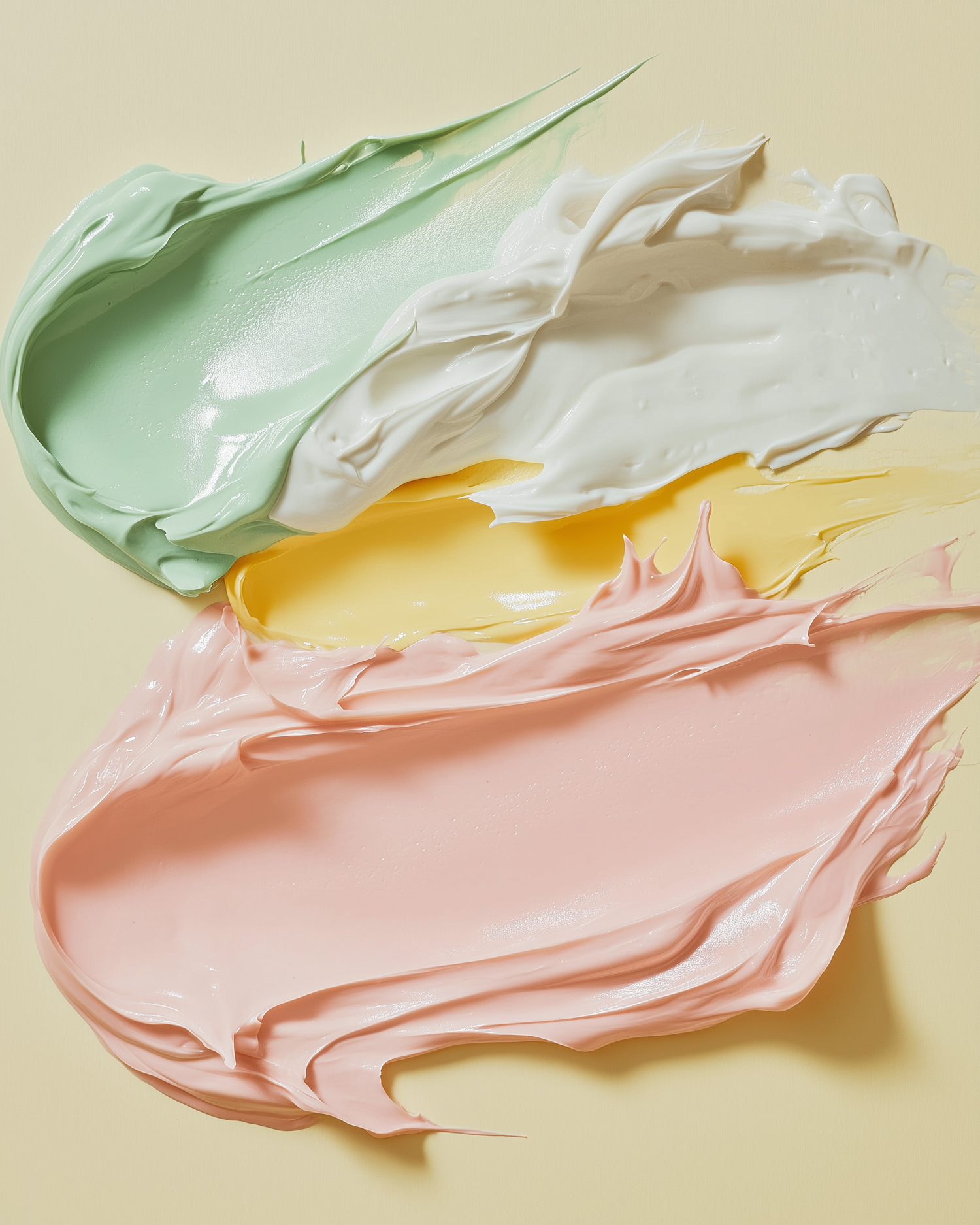 Artistic swirls of pastel creams in mint, white, yellow, and pink on a beige background, showcasing texture and color harmony.