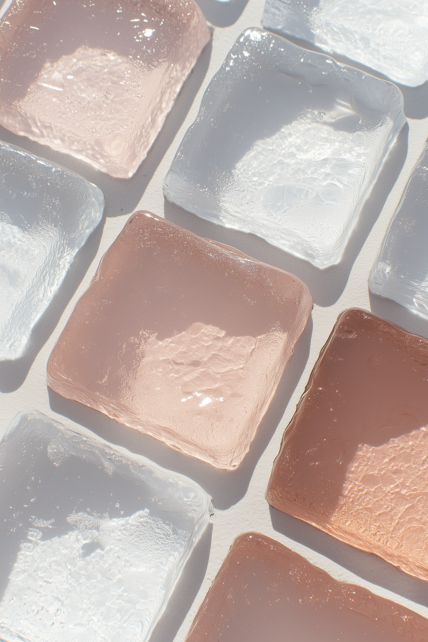 Close-up of textured translucent tiles in pastel pink and clear white, arranged in a grid with soft light reflections and shadows.