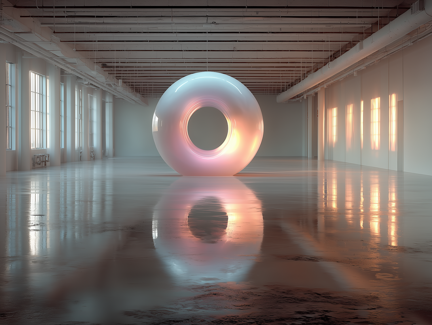 A glowing pastel torus sculpture in a spacious industrial room with polished floors and large windows casting soft light.