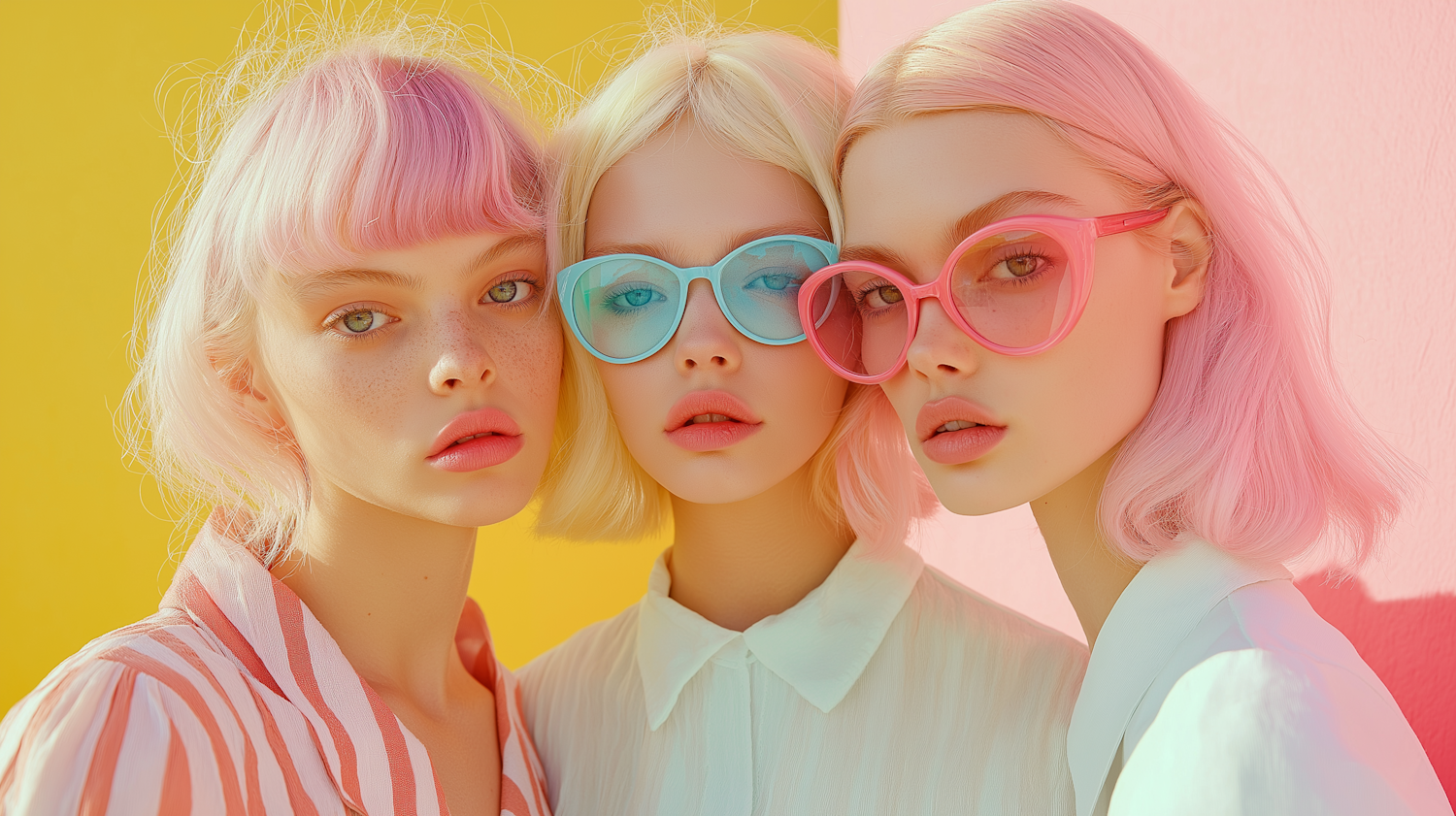 Three women with pastel hair and oversized glasses pose against a vibrant yellow and pink background, creating a dreamy, modern aesthetic.
