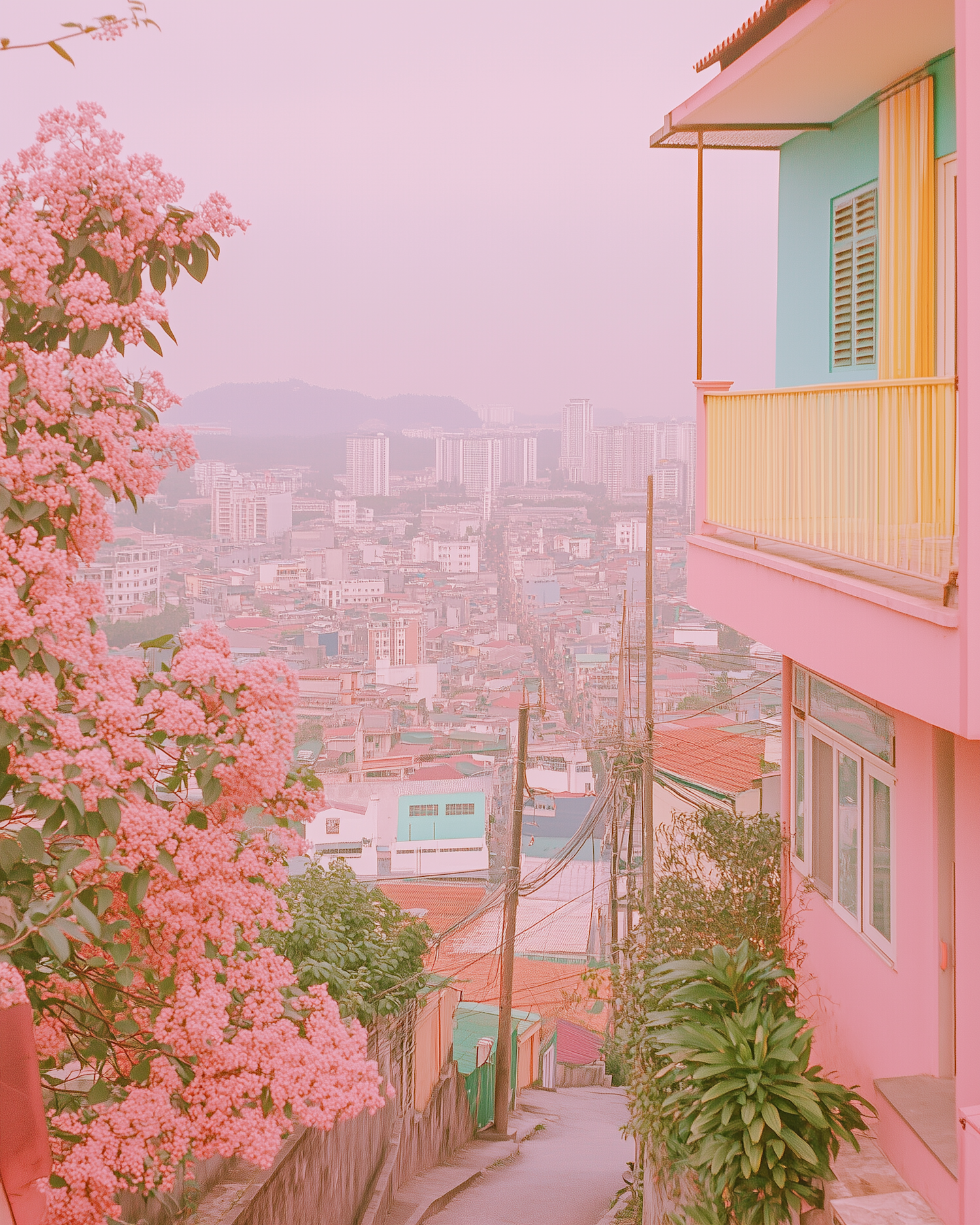 Pastel cityscape with pink blossoms and colorful buildings, creating a dreamy, serene atmosphere.
