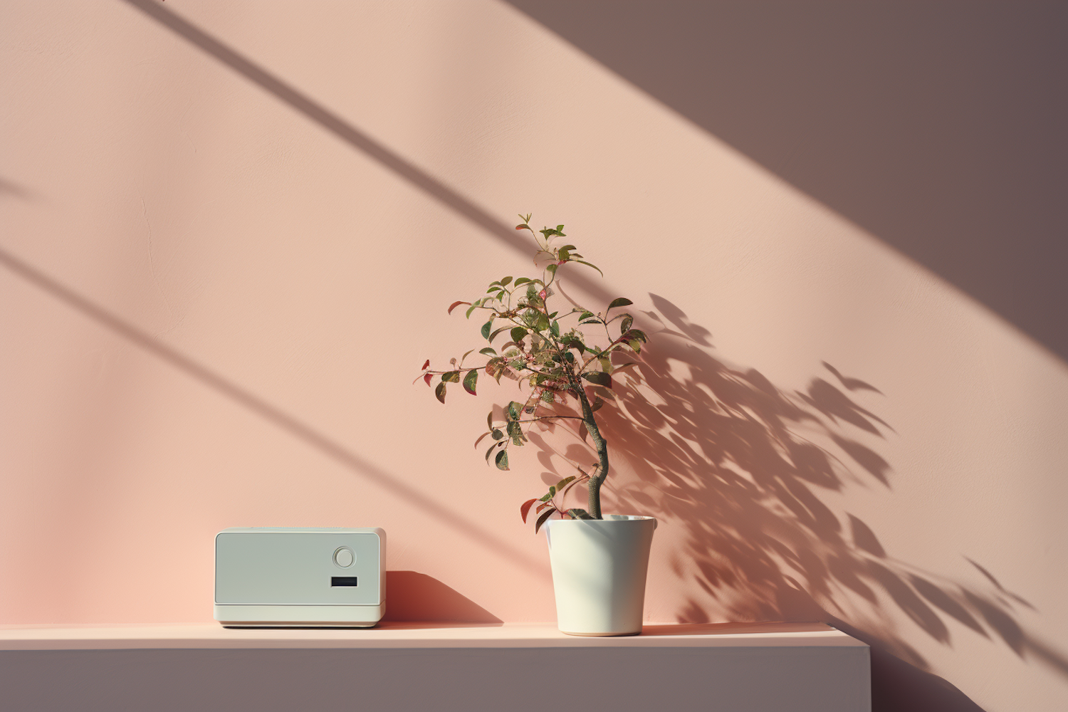 Minimalist scene with a modern device and potted plant casting shadows on a soft pink wall.