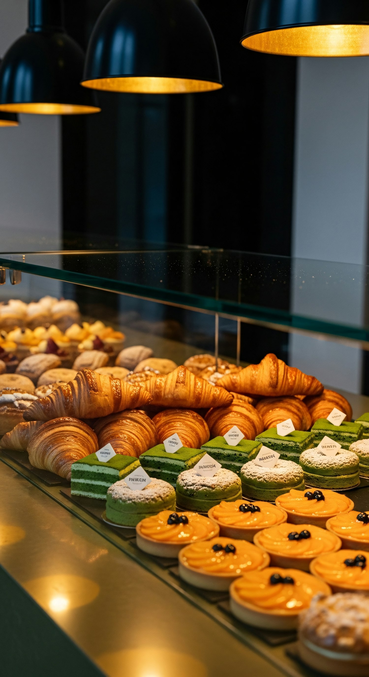 A tempting display of croissants, matcha cakes, and tarts under warm lighting, perfect for pastry lovers.