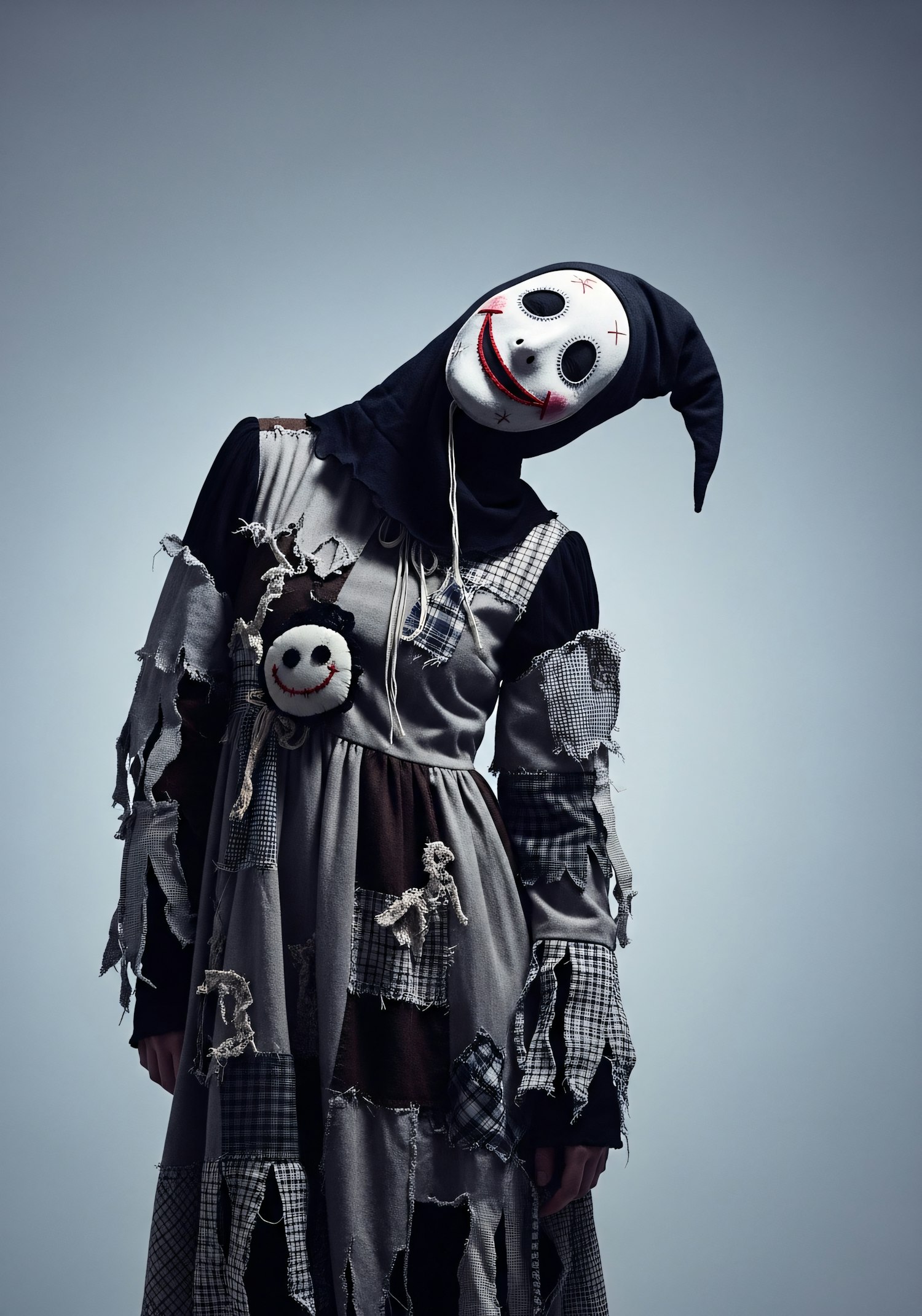 A person in a tattered patchwork costume and eerie mask poses against a neutral background, creating a mysterious and theatrical vibe.