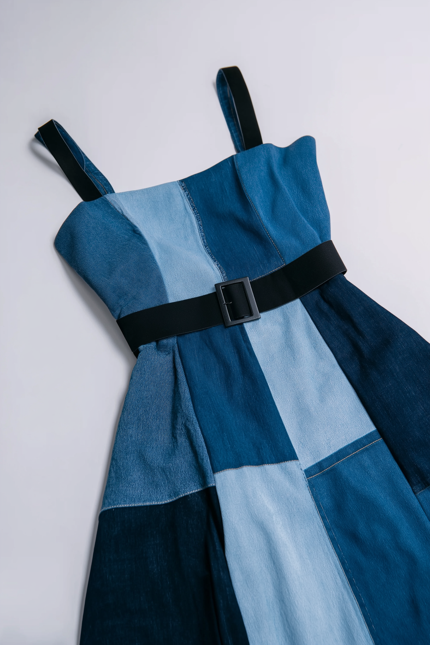 Stylish patchwork denim dress in shades of blue with a black belt and straps, perfect for casual or semi-formal occasions.