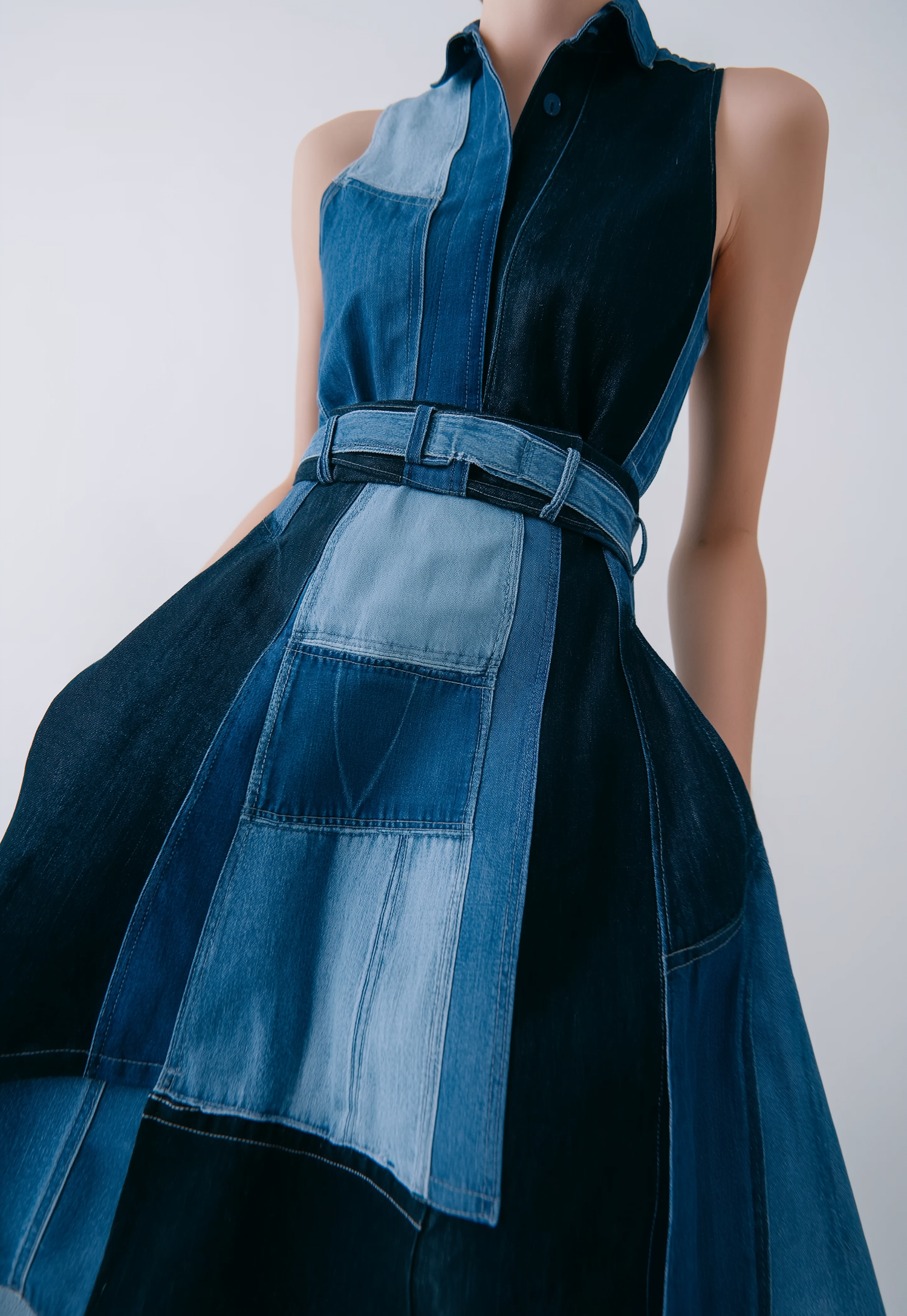 A stylish patchwork denim dress with a collared neckline and belt, showcasing various shades of blue in a modern design.