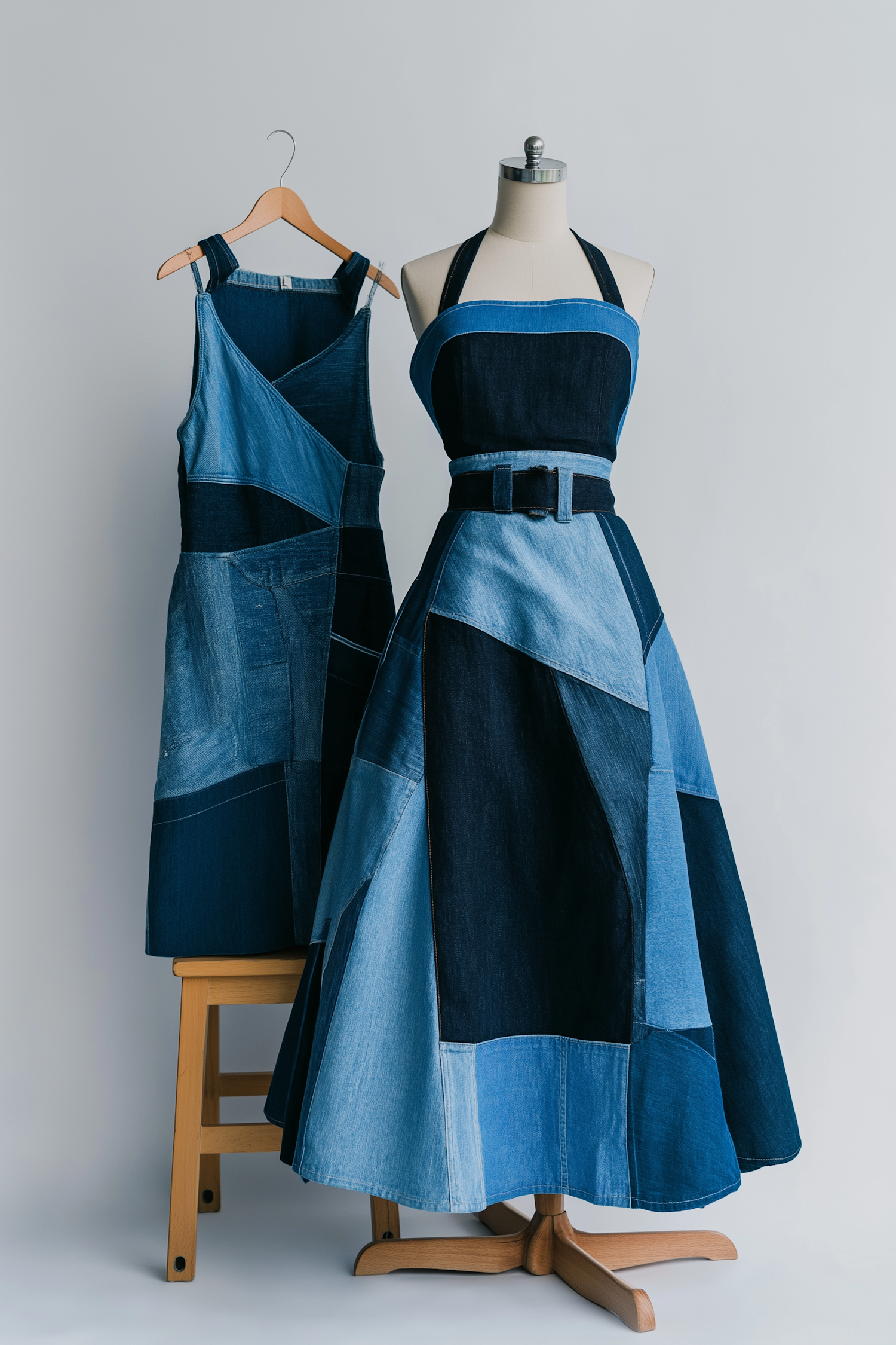 Two stylish denim dresses in patchwork design, one on a mannequin and one on a hanger, showcasing creative use of blue shades.