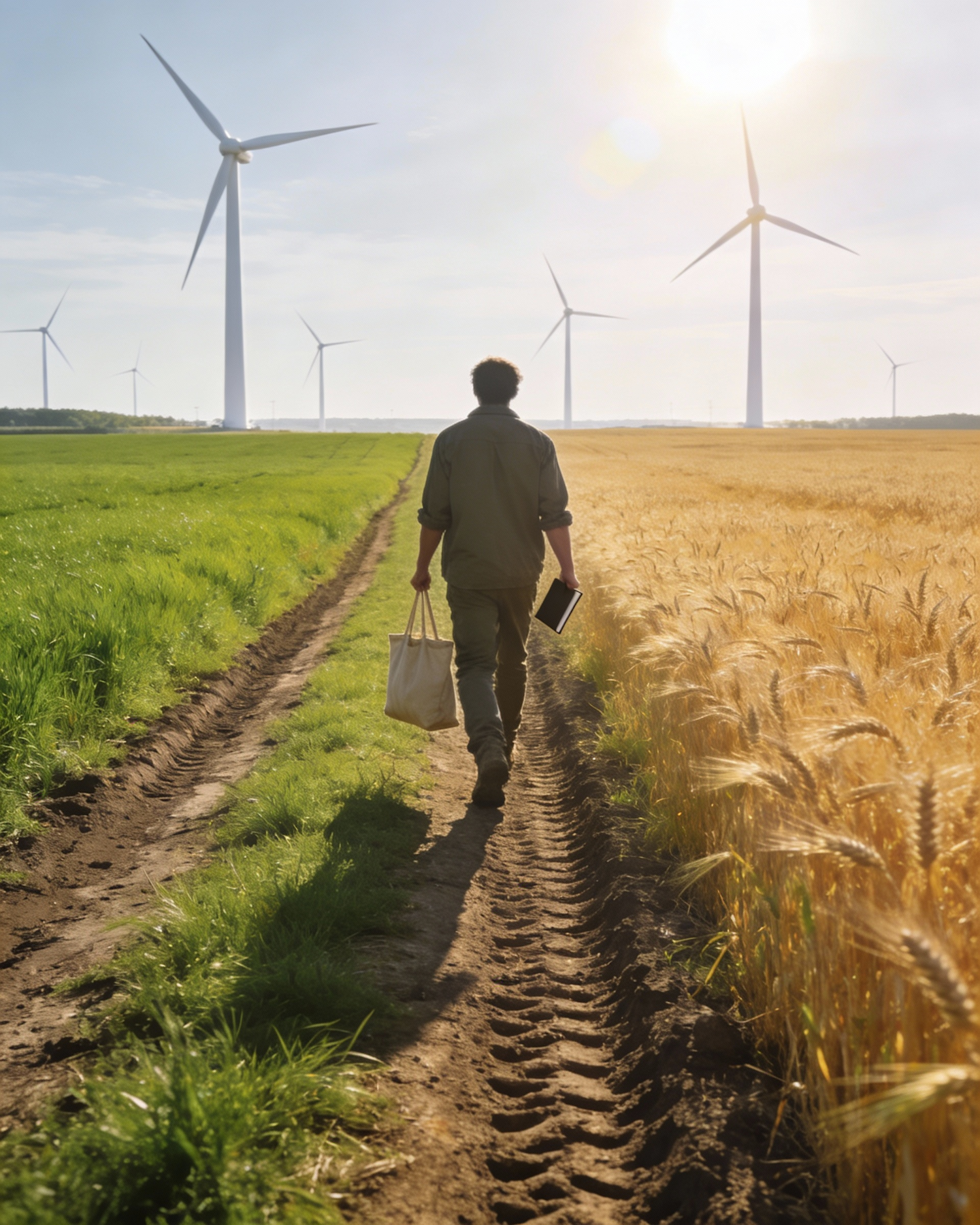 Ultra-realistic lifestyle/documentary photograph, person in simple casual workwear walking along a dirt tractor track that forms a clear boundary between a vivid green field and golden wheat, carrying a plain canvas tote and a small notebook, distant wind turbines on the horizon, bright sunny day with light haze (sun out of frame), natural vibrant greens and warm golds, gentle motion in wheat and grass, clean stock documentary look, 35 mm, f/5.6, ISO 100, 1/1000 s; circular polarizer to deepen sky and control glare. Negative: readable logos, visible sun disk, lens flare, HDR look, halos, neon saturation.