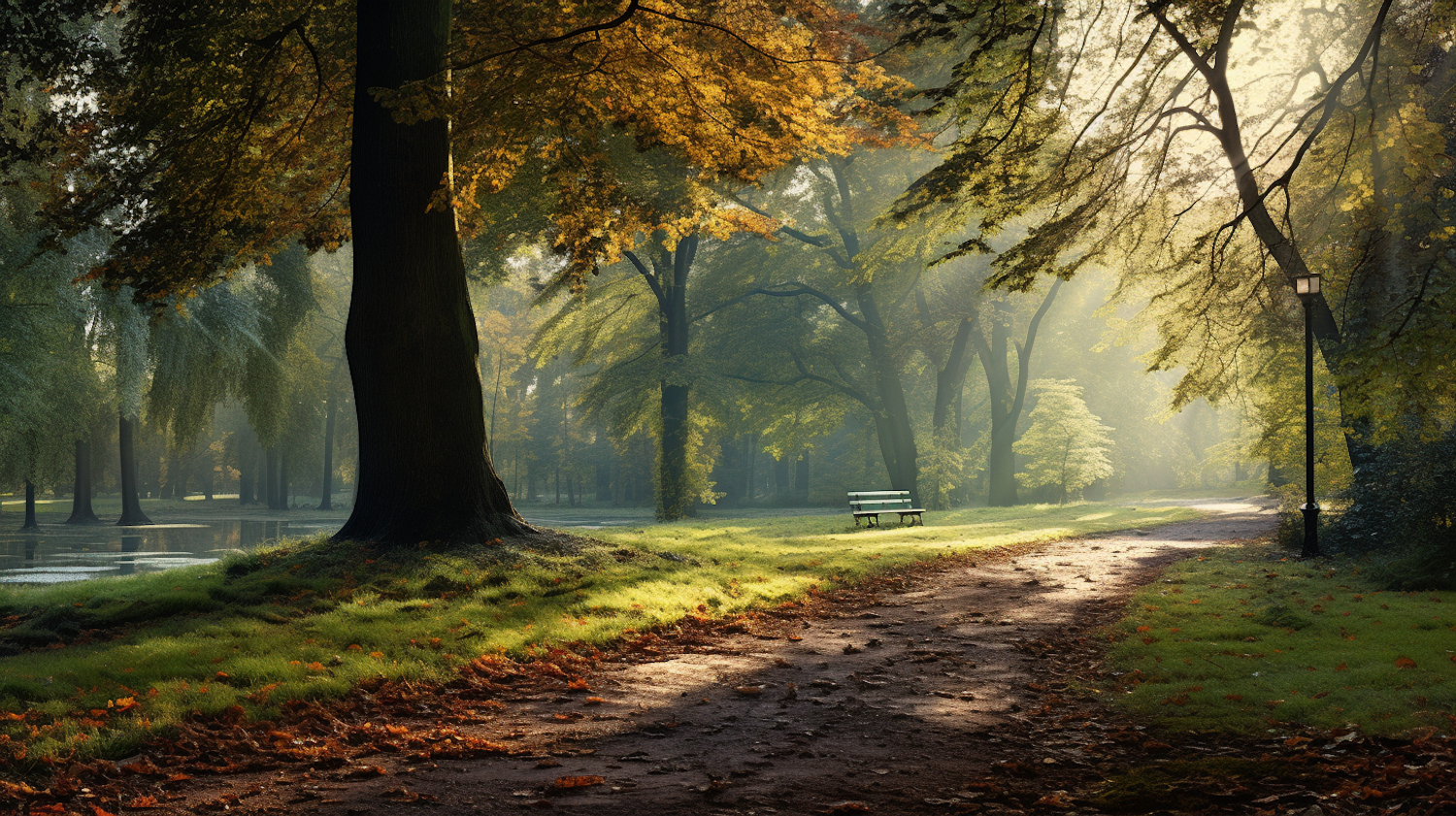 Tranquil park scene with sunlit path, green bench, and golden autumn leaves. Perfect for a peaceful nature escape.