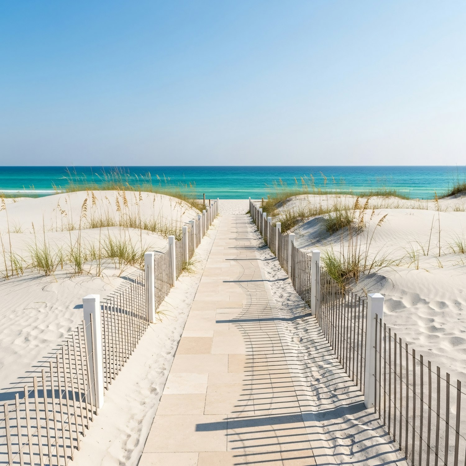 A peaceful boardwalk leads through white sand dunes to a turquoise ocean under a clear blue sky, perfect for a relaxing beach day.