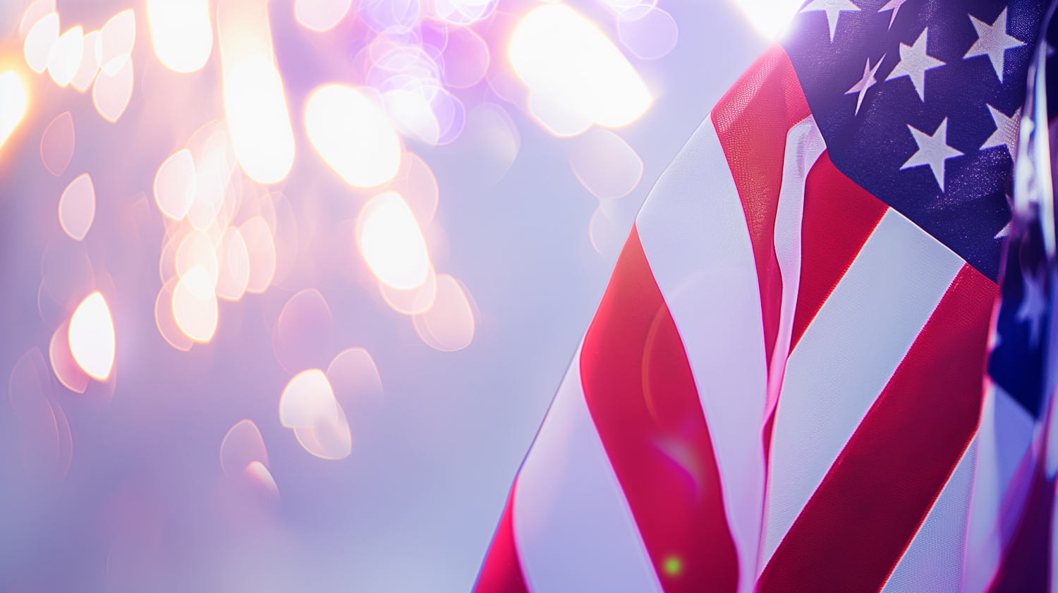 Close-up of the American flag with festive bokeh lights in the background, creating a patriotic and celebratory atmosphere.