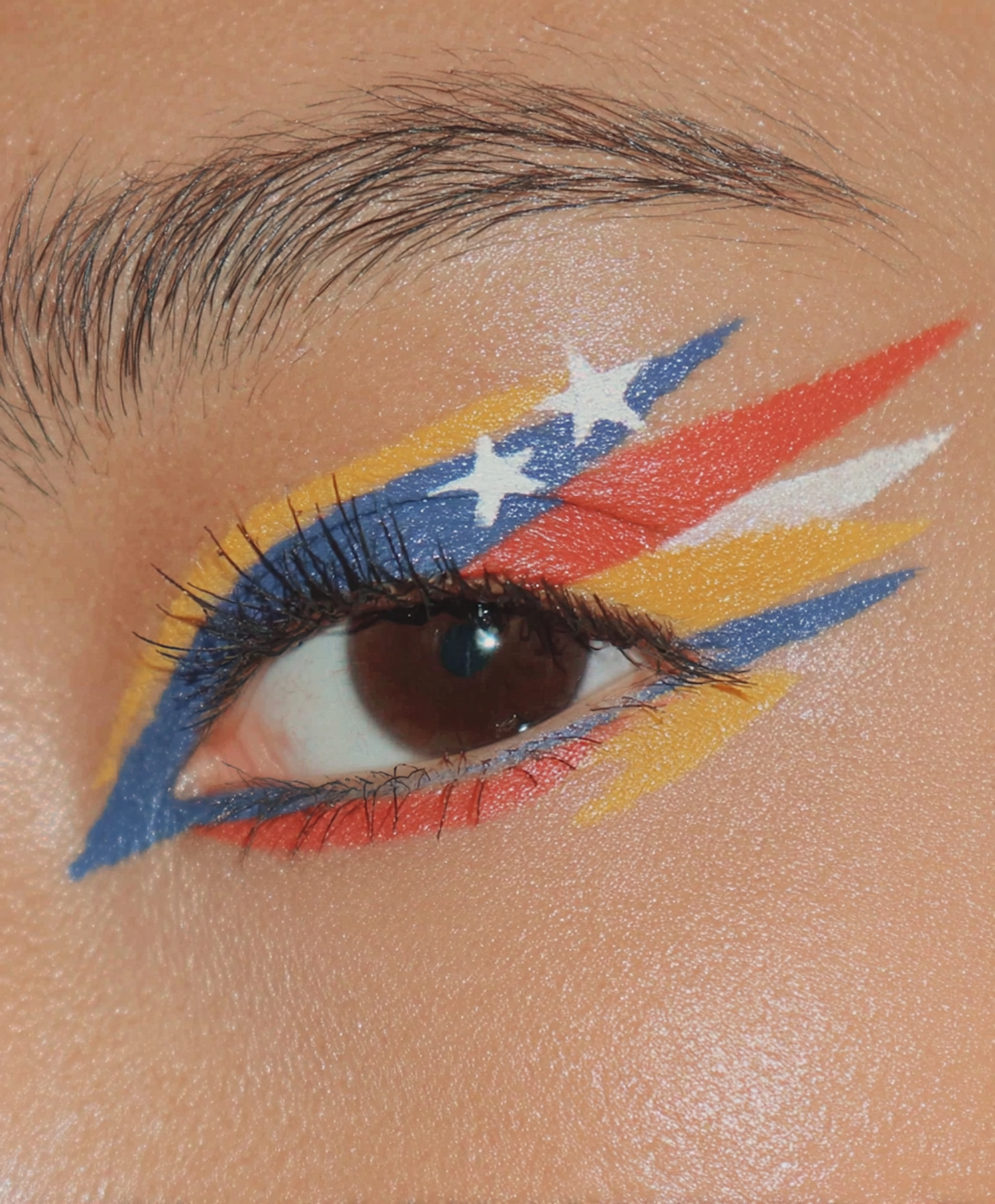 Close-up of an eye with vibrant flag-inspired makeup in blue, red, yellow, and white, featuring stars and bold lines.