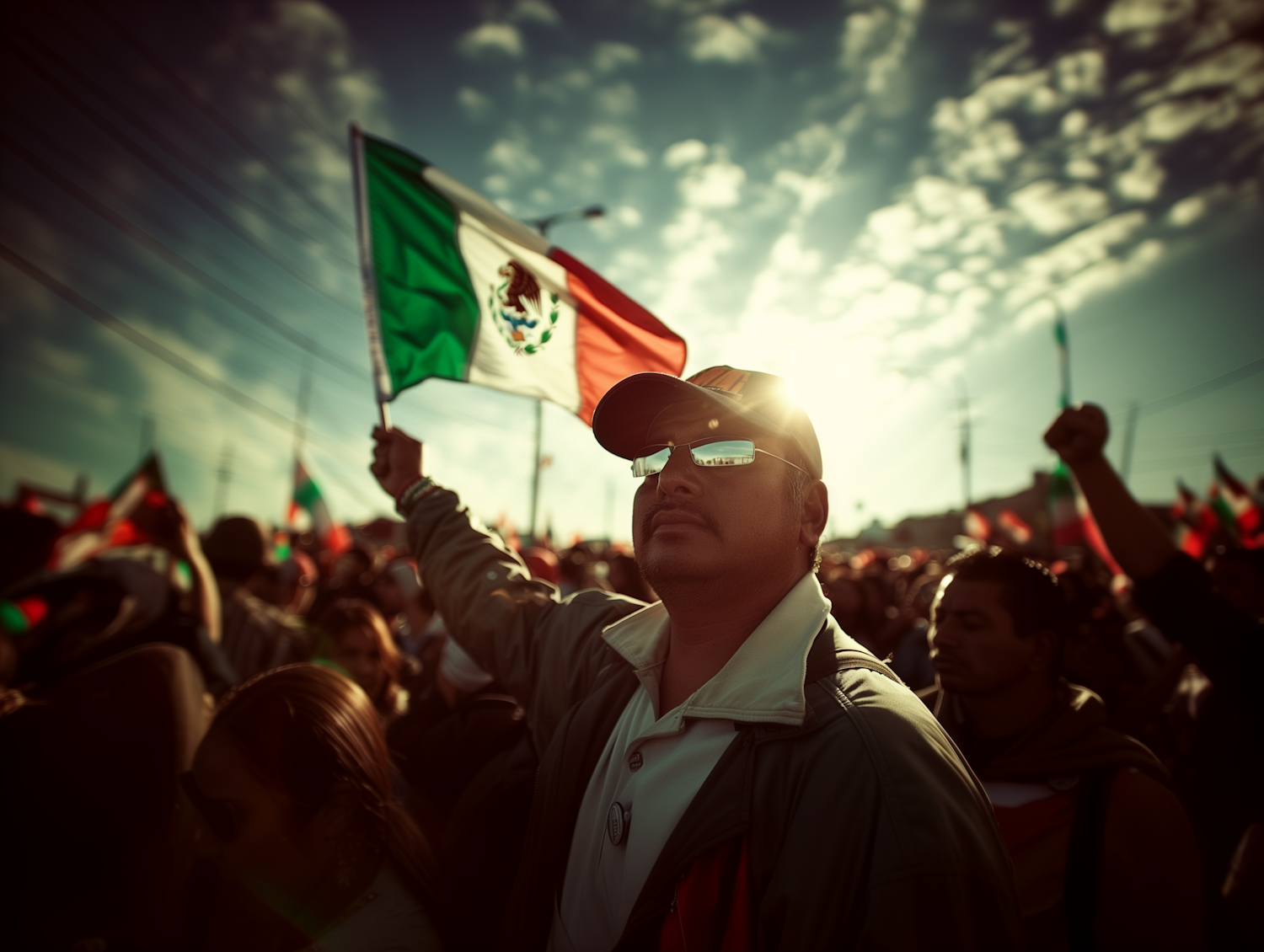 Man in a crowd holds a Mexican flag at sunset, symbolizing unity and pride. Sunglasses and cap add to his determined look.