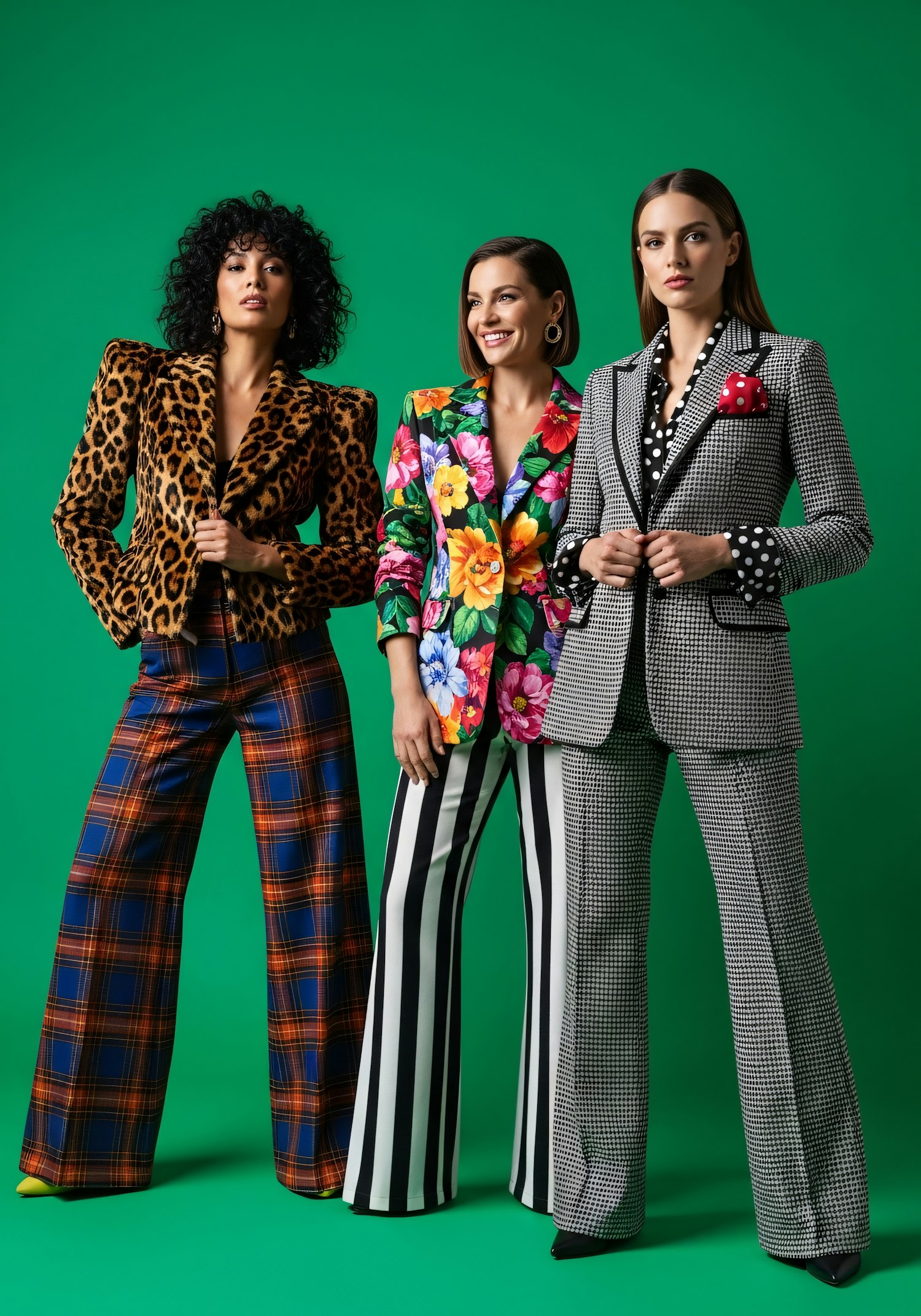 Three women in bold, patterned outfits stand against a green background, showcasing unique fashion styles with vibrant colors and textures.