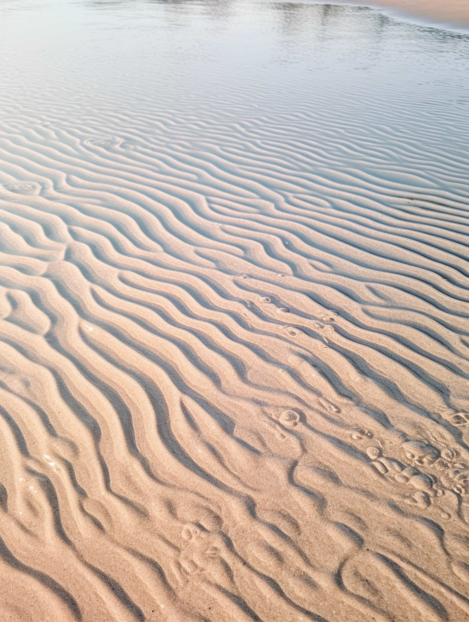 Rippled sand patterns on a tranquil beach with soft lighting and a reflective water surface, creating a serene and peaceful atmosphere.