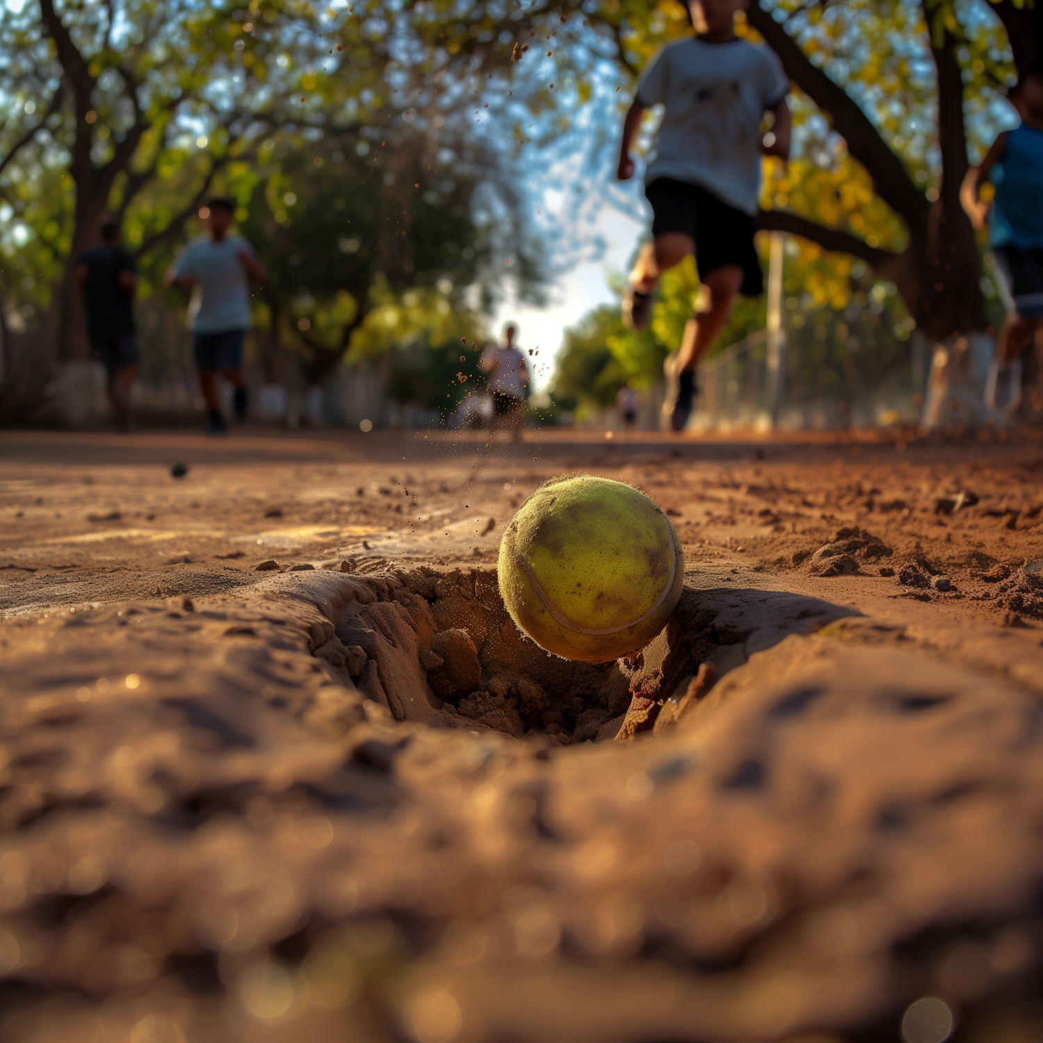 Tennis ball bouncing on a dirt path with people running in the background, creating a lively and dynamic outdoor scene.