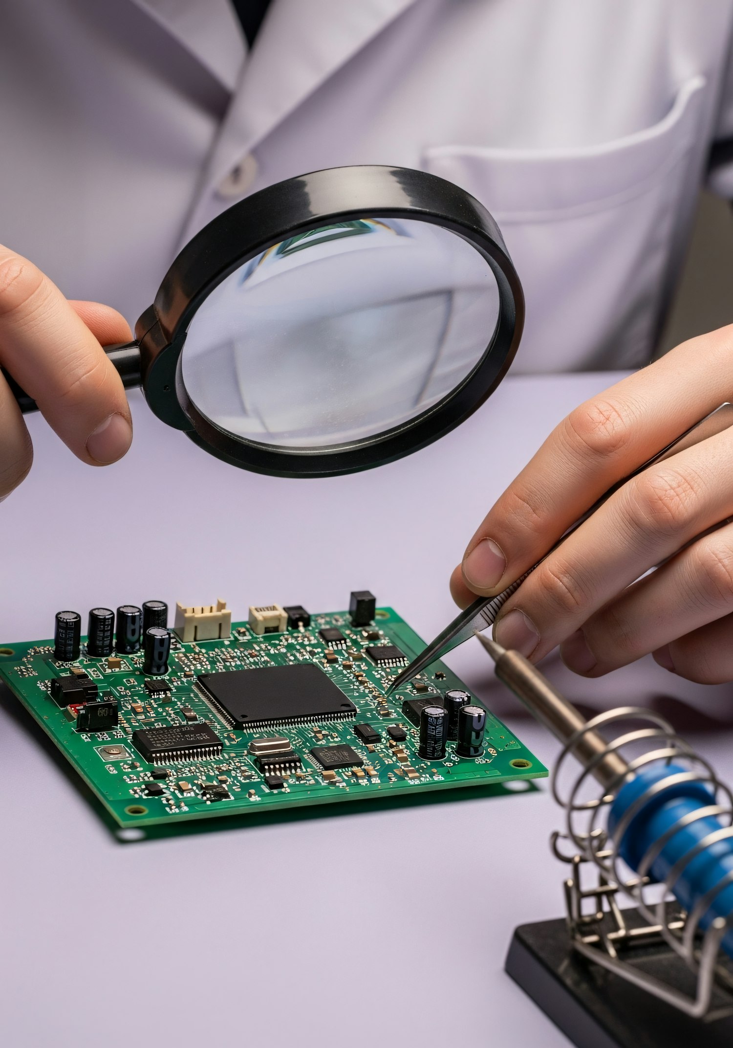 Close-up of a technician inspecting a circuit board with a magnifying glass and tweezers, showcasing detailed electronic components.