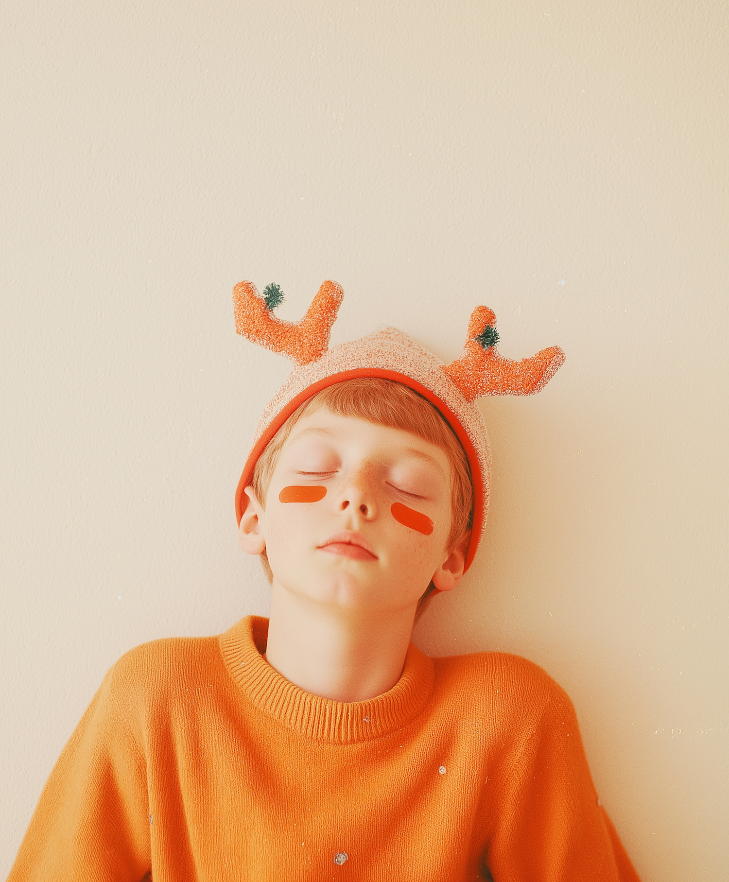 Young boy in orange sweater and antler hat with face paint, eyes closed, leaning against a wall. Warm, whimsical scene.