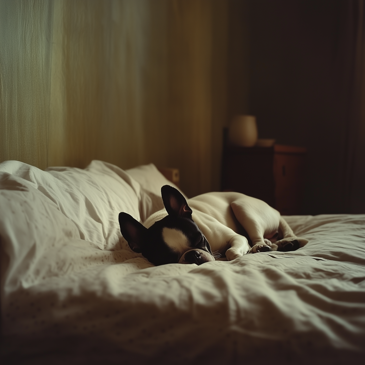 A black and white dog sleeps peacefully on a cozy bed in a warmly lit room, creating a serene and tranquil atmosphere.