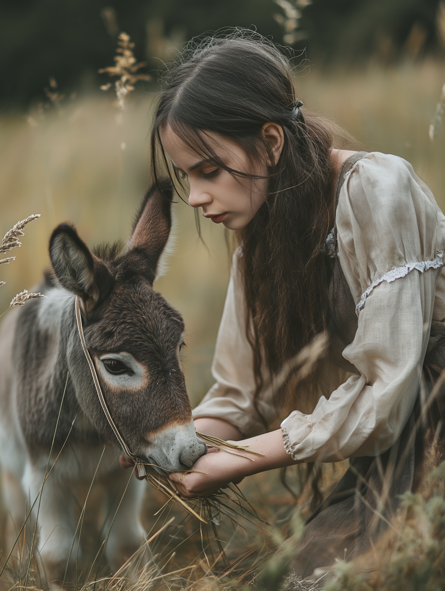 A young woman in a meadow feeds a small donkey, creating a serene and pastoral scene with tall grasses and gentle interaction.
