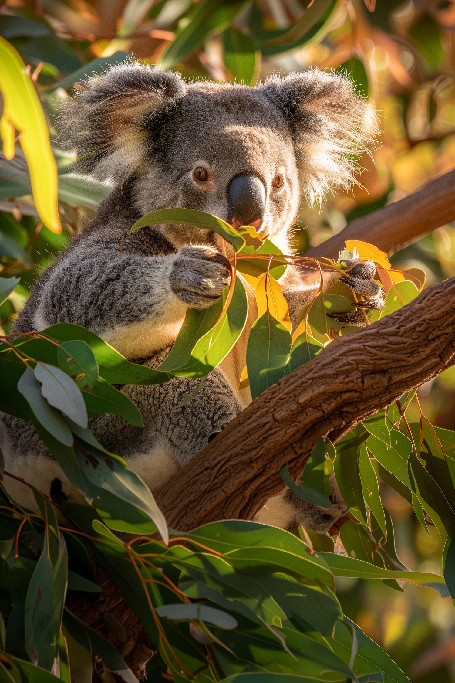 A koala munching on eucalyptus leaves in a sunlit tree, showcasing its fluffy fur and natural habitat.
