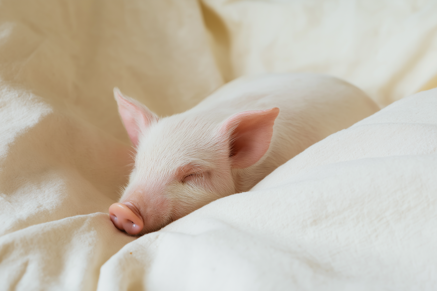 A young piglet sleeping peacefully on soft, cream-colored fabric, exuding warmth and charm in this serene and cozy image.