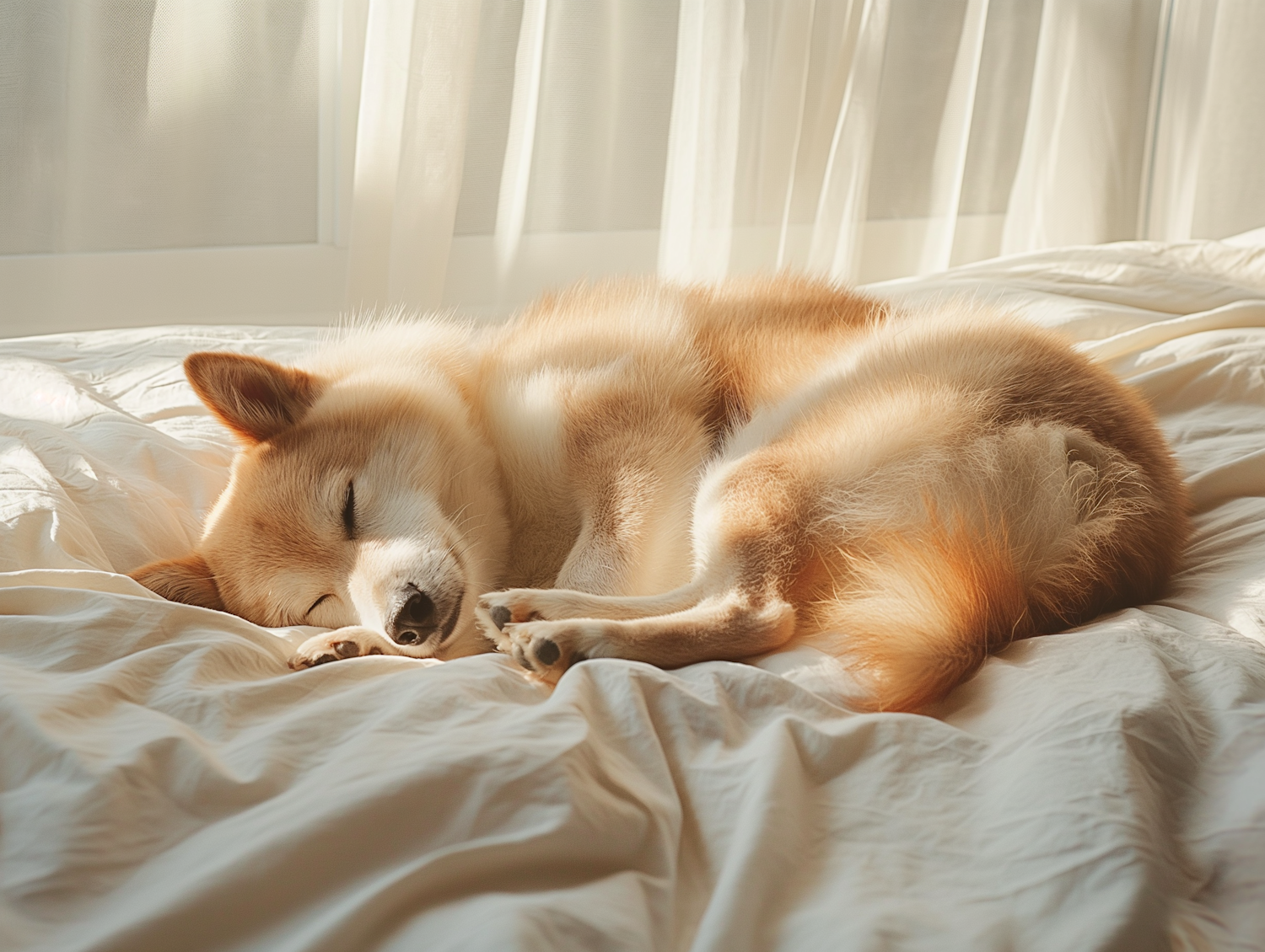 A fluffy dog with a light brown coat sleeps peacefully on a sunlit bed, creating a serene and cozy atmosphere.