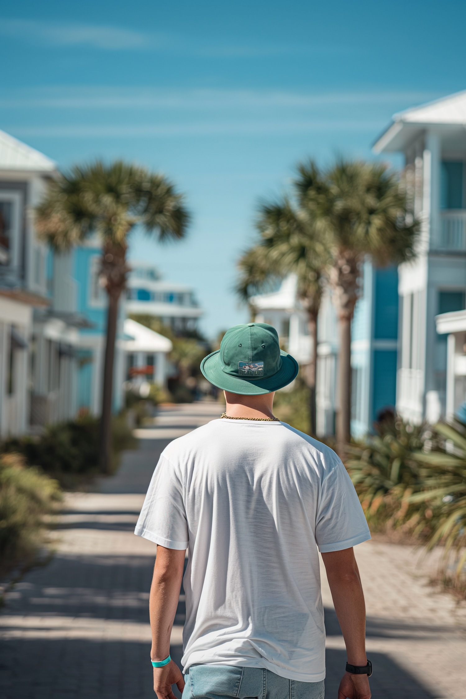 Man in green bucket hat and white t-shirt walking down a sunny street with palm trees and pastel-colored houses.