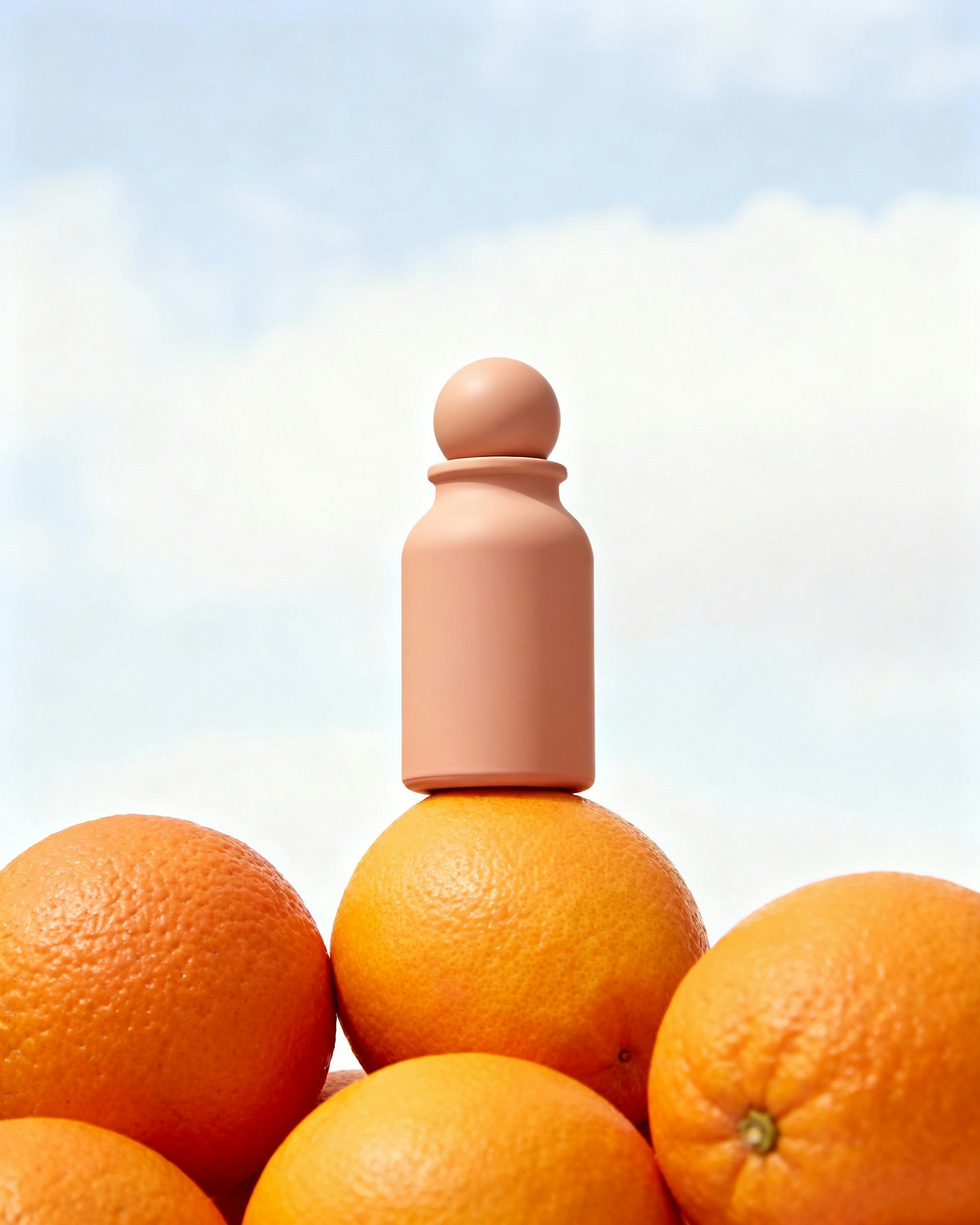 A peach-colored bottle with a spherical cap sits atop a stack of oranges against a soft blue sky, creating a minimalist and vibrant scene.