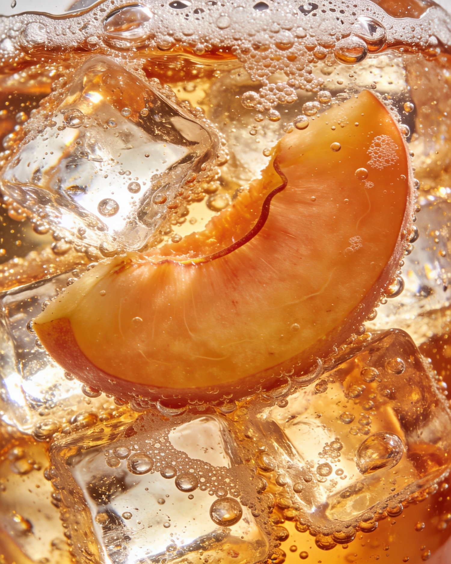 Close-up of a peach slice in a fizzy golden drink with ice cubes, showcasing refreshing textures and vibrant colors.