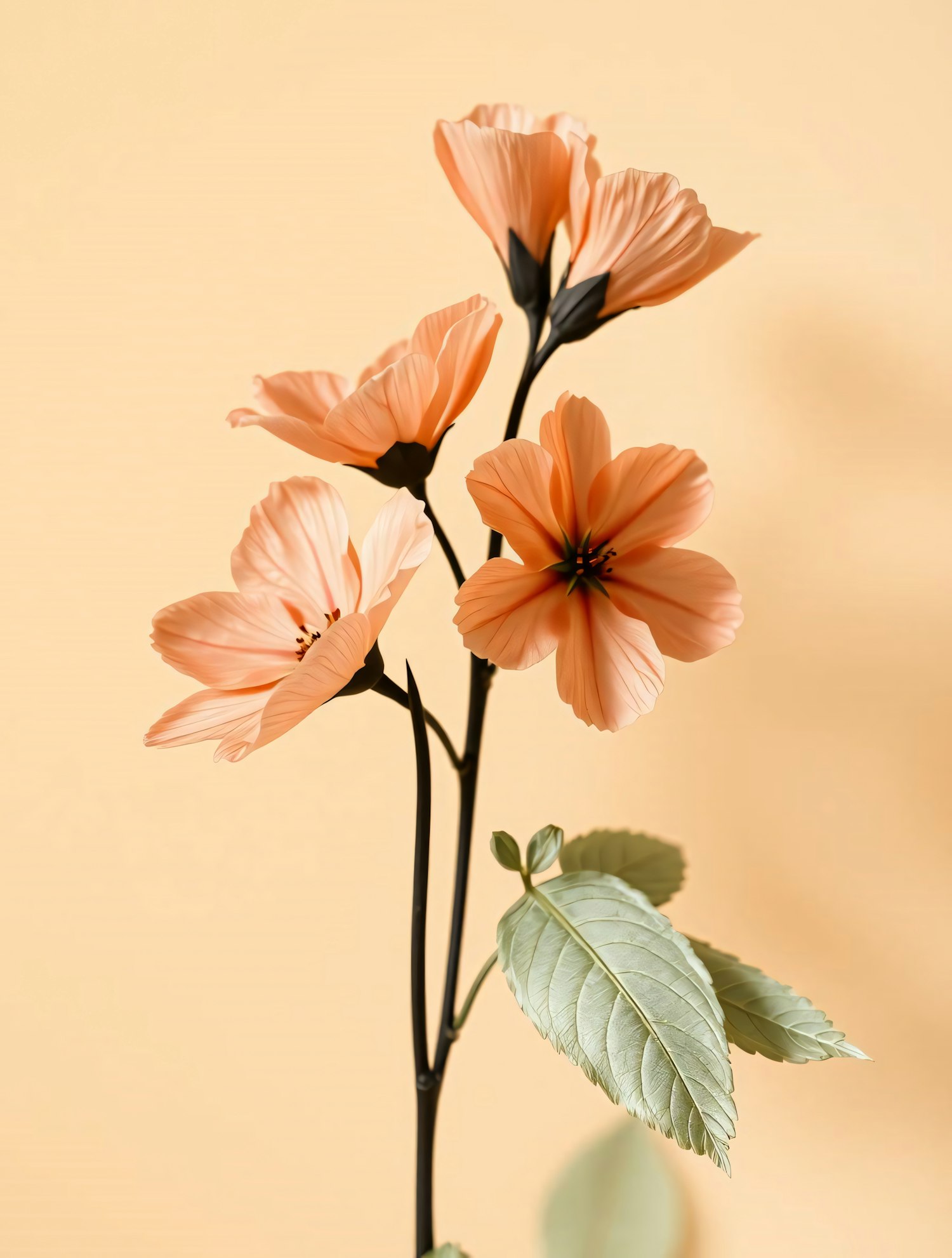 Elegant peach-colored flowers with green leaves on a beige background, showcasing natural beauty and intricate details.