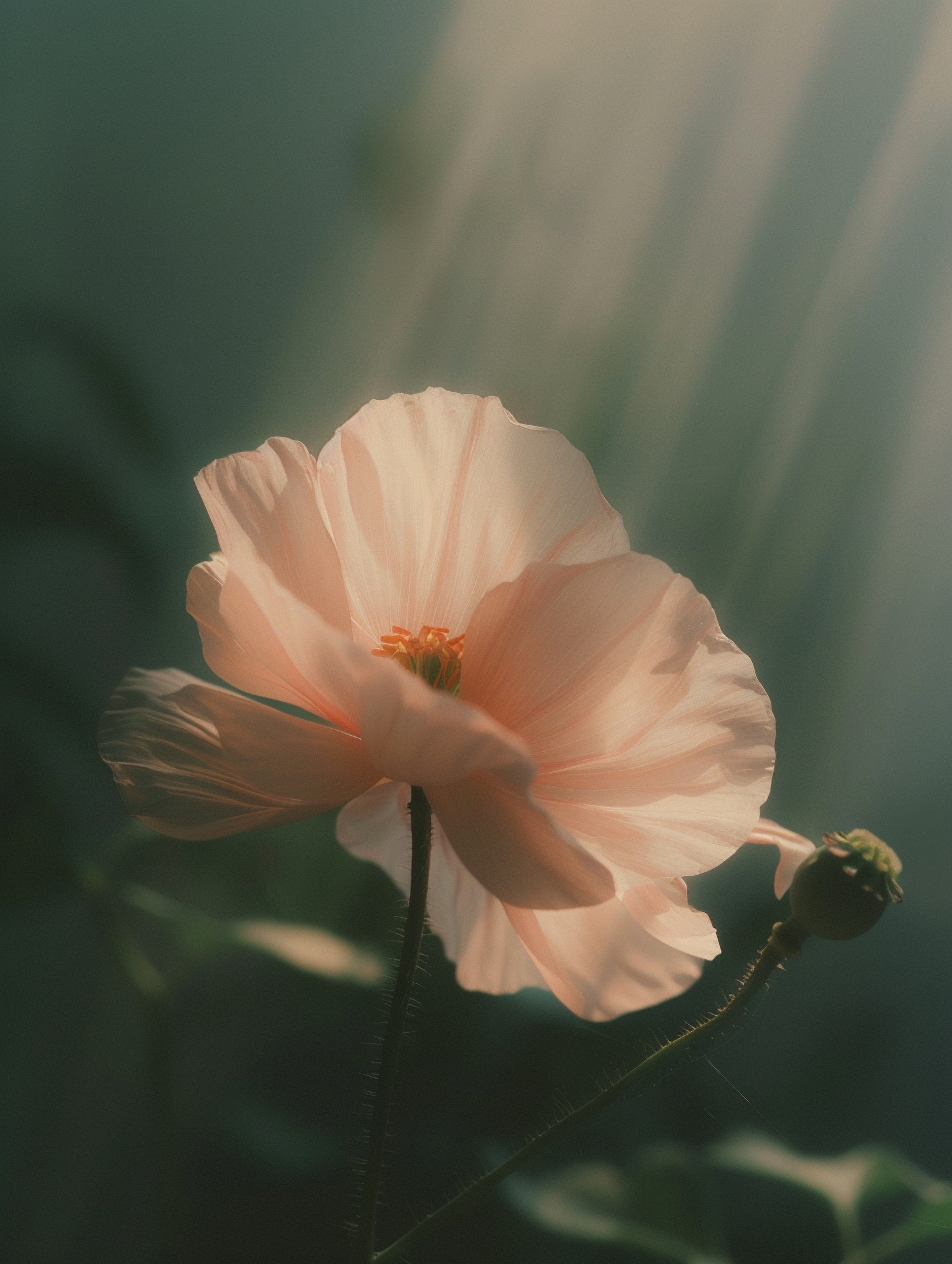 A soft peach flower glows in sunlight, with delicate petals and a blurred green background creating a serene, dreamy vibe.