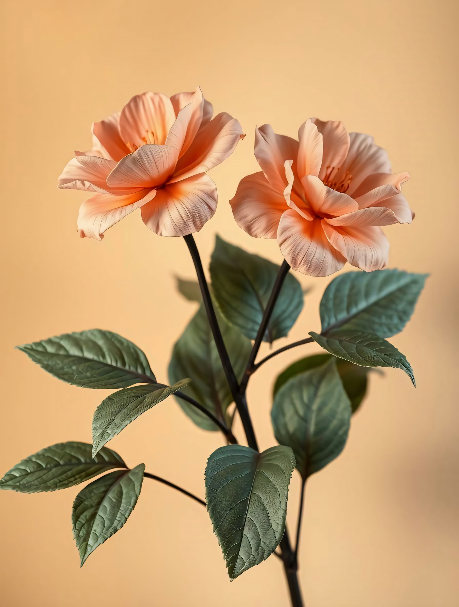 Two peach-colored flowers with green leaves on a beige background, showcasing their delicate petals and natural beauty.