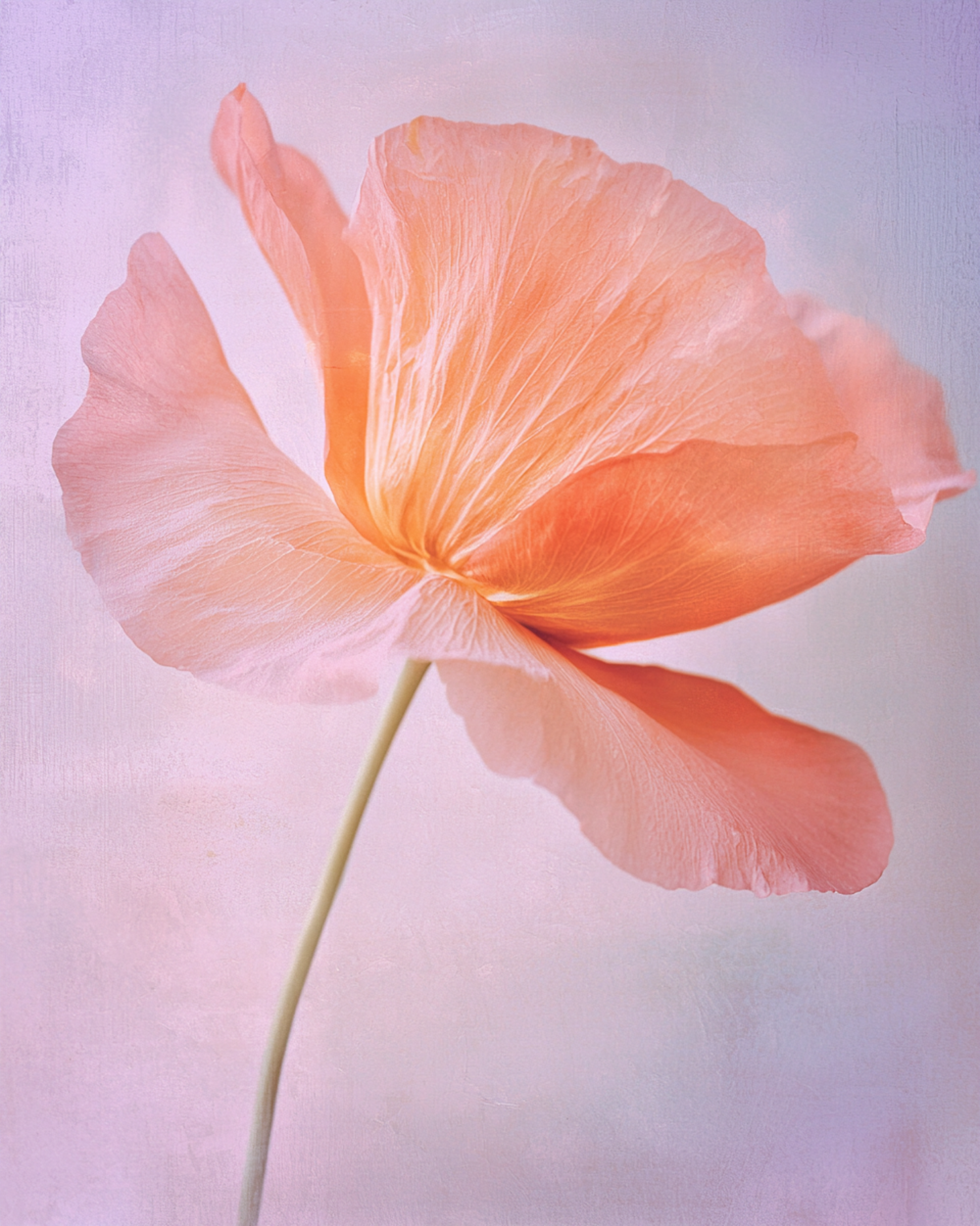 A dreamy close-up of a peach poppy with soft, translucent petals against a pastel lavender and pink background.