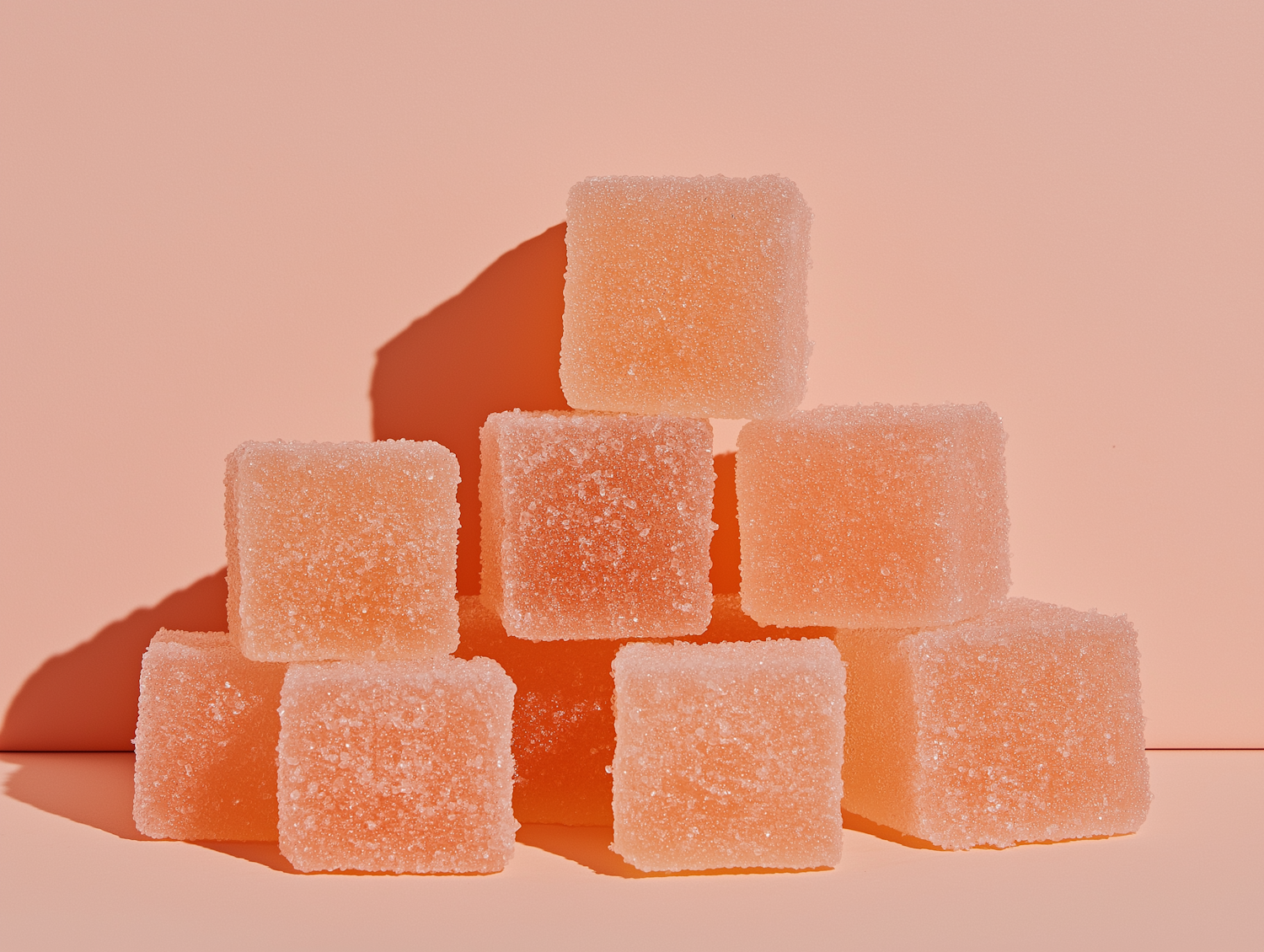 A pyramid of light orange sugar cubes against a peach background, showcasing texture and color in a simple, elegant arrangement.