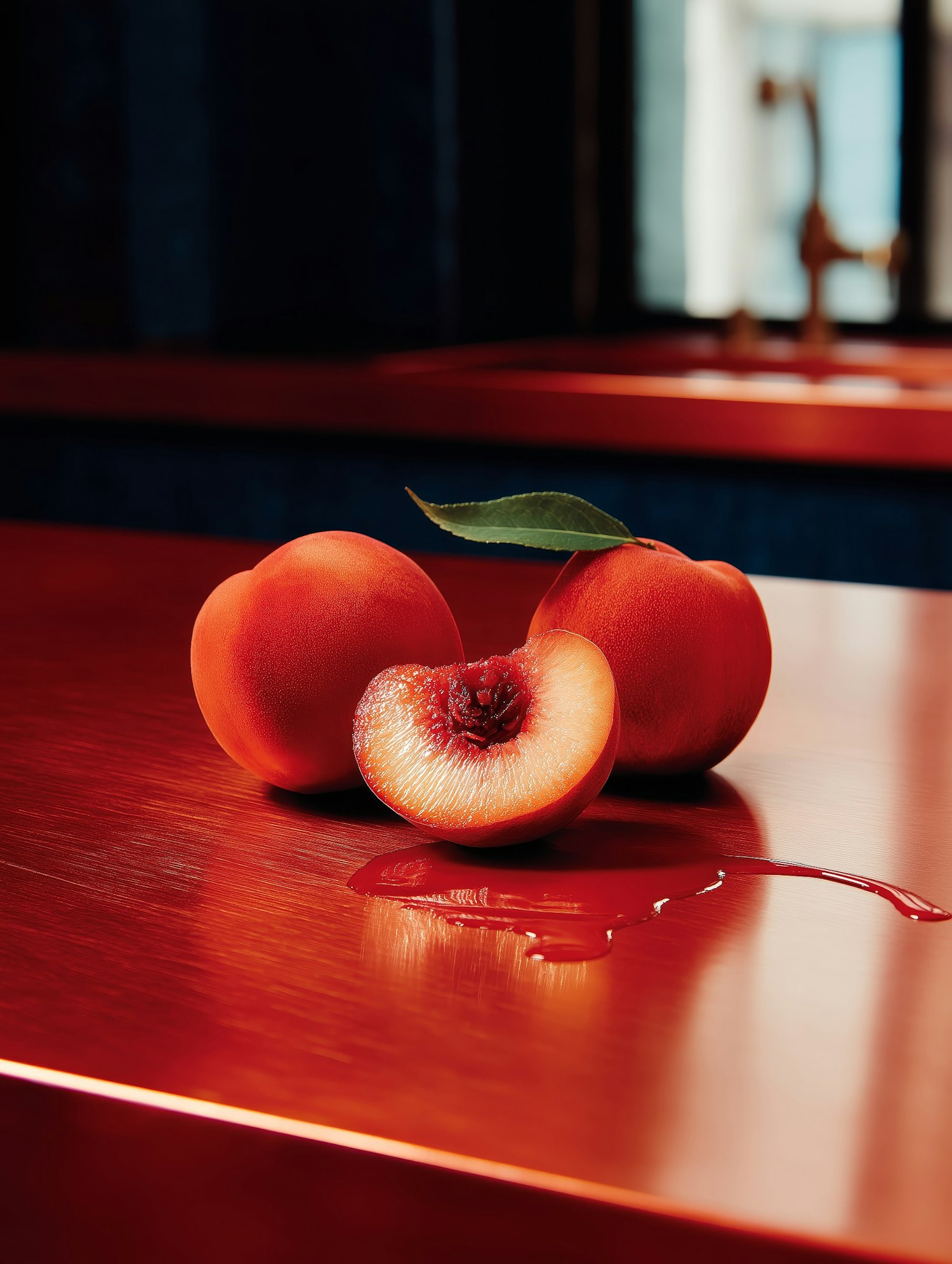 Three ripe peaches, one sliced open, rest on a glossy red surface with juice glistening, creating a vibrant and fresh composition.