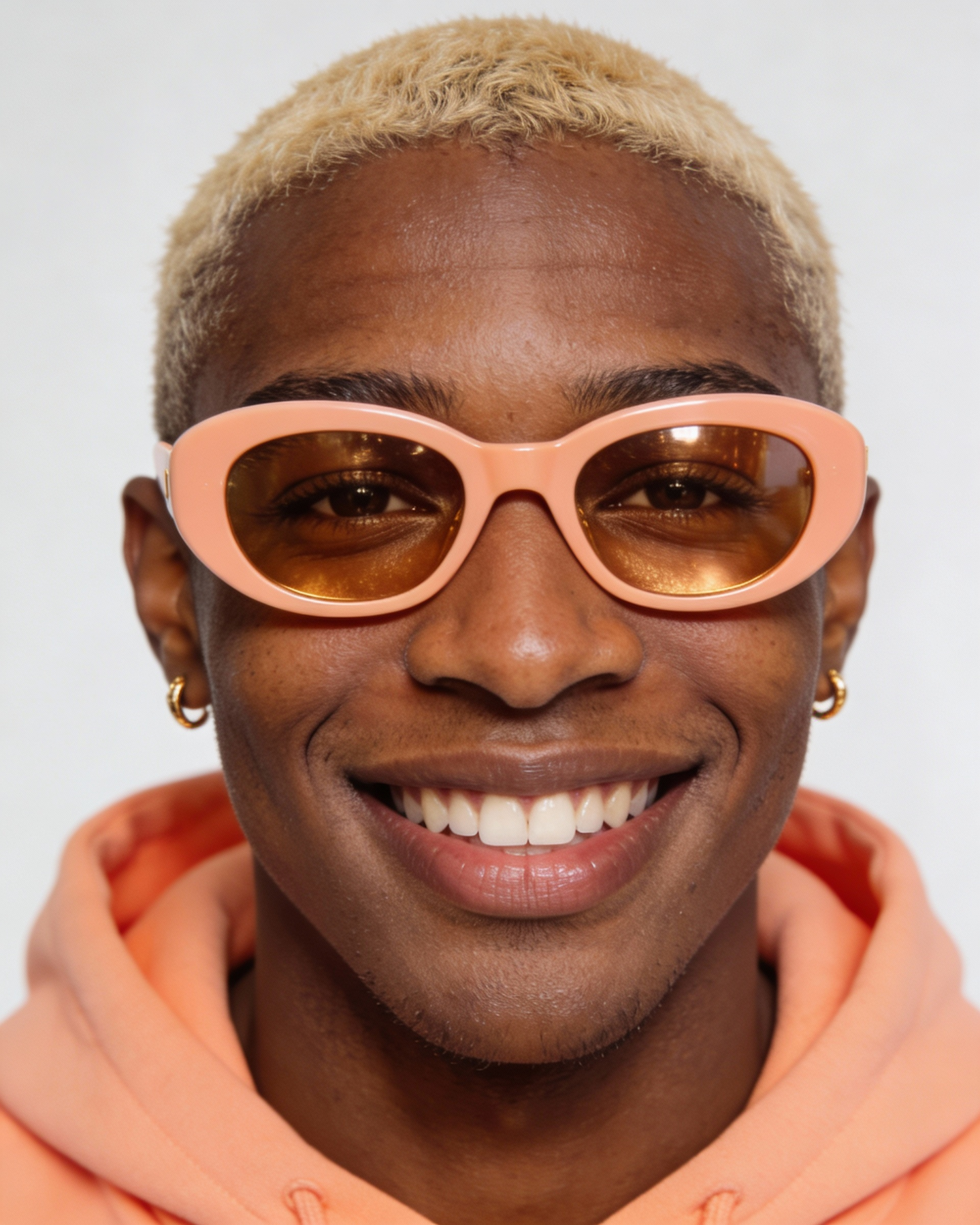 Close-up portrait, straight-on angle. Smiling man with short blond hair, dark skin, wearing pastel‑peach sunglasses with bronze lenses, a warm peach hoodie, and small gold earrings. Bright studio lighting, minimal light background. Modern fashion editorial photography, clean and vibrant style.