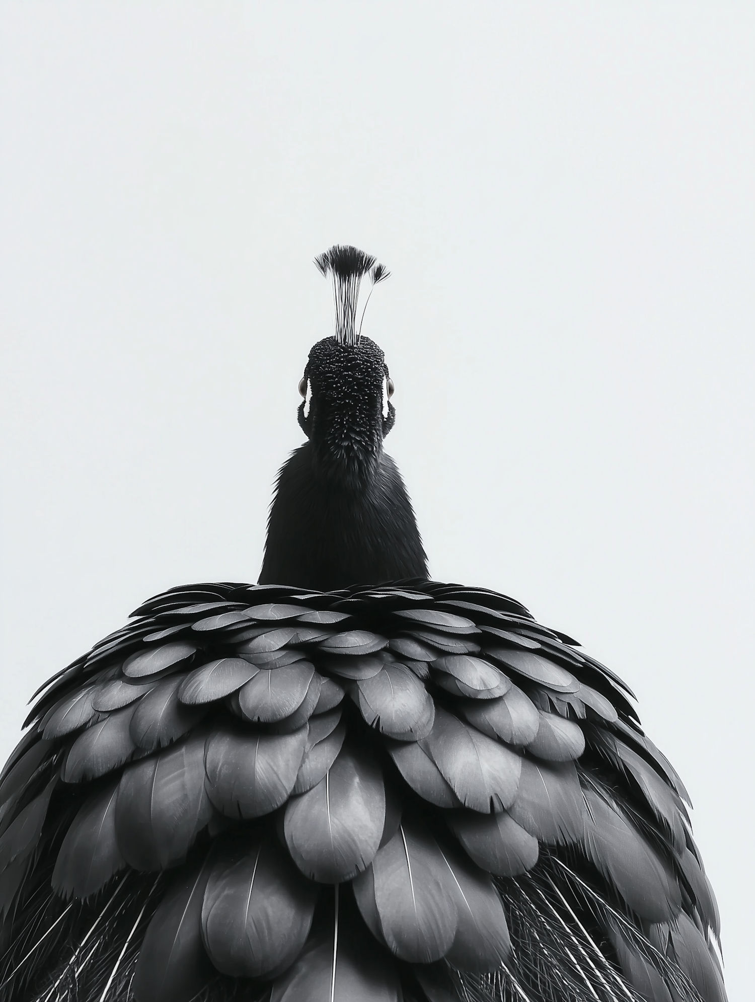 A black-and-white close-up of a peacock's back, highlighting its detailed feathers and crest against a minimalistic backdrop.