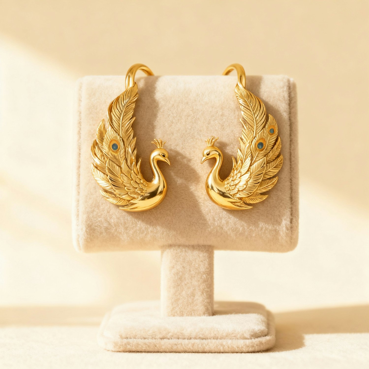 Elegant gold peacock-shaped earrings with intricate feather details and blue accents, displayed on a soft beige stand in warm lighting.
