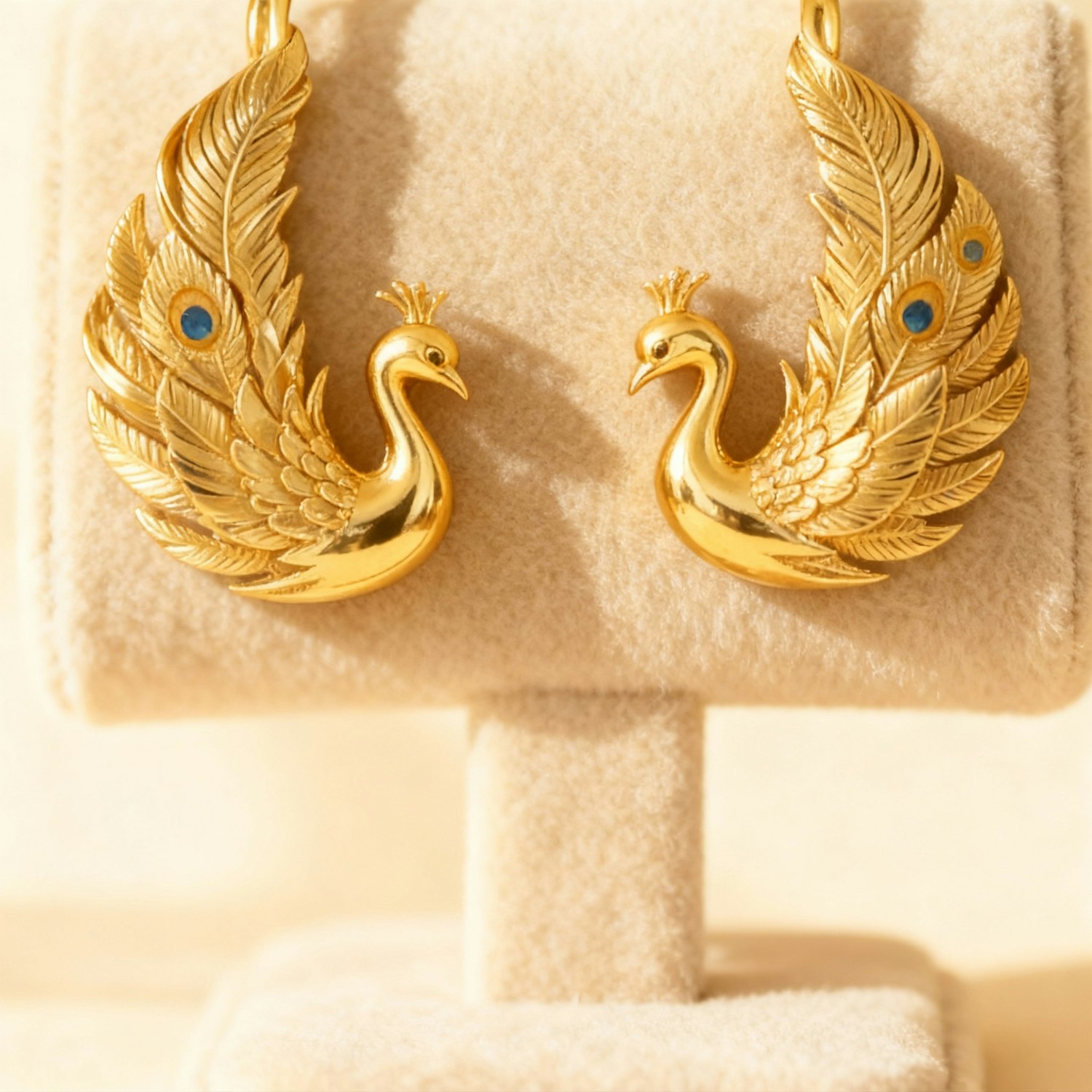 Elegant gold peacock-shaped earrings with intricate feather details and blue accents, displayed on a soft beige velvet stand.