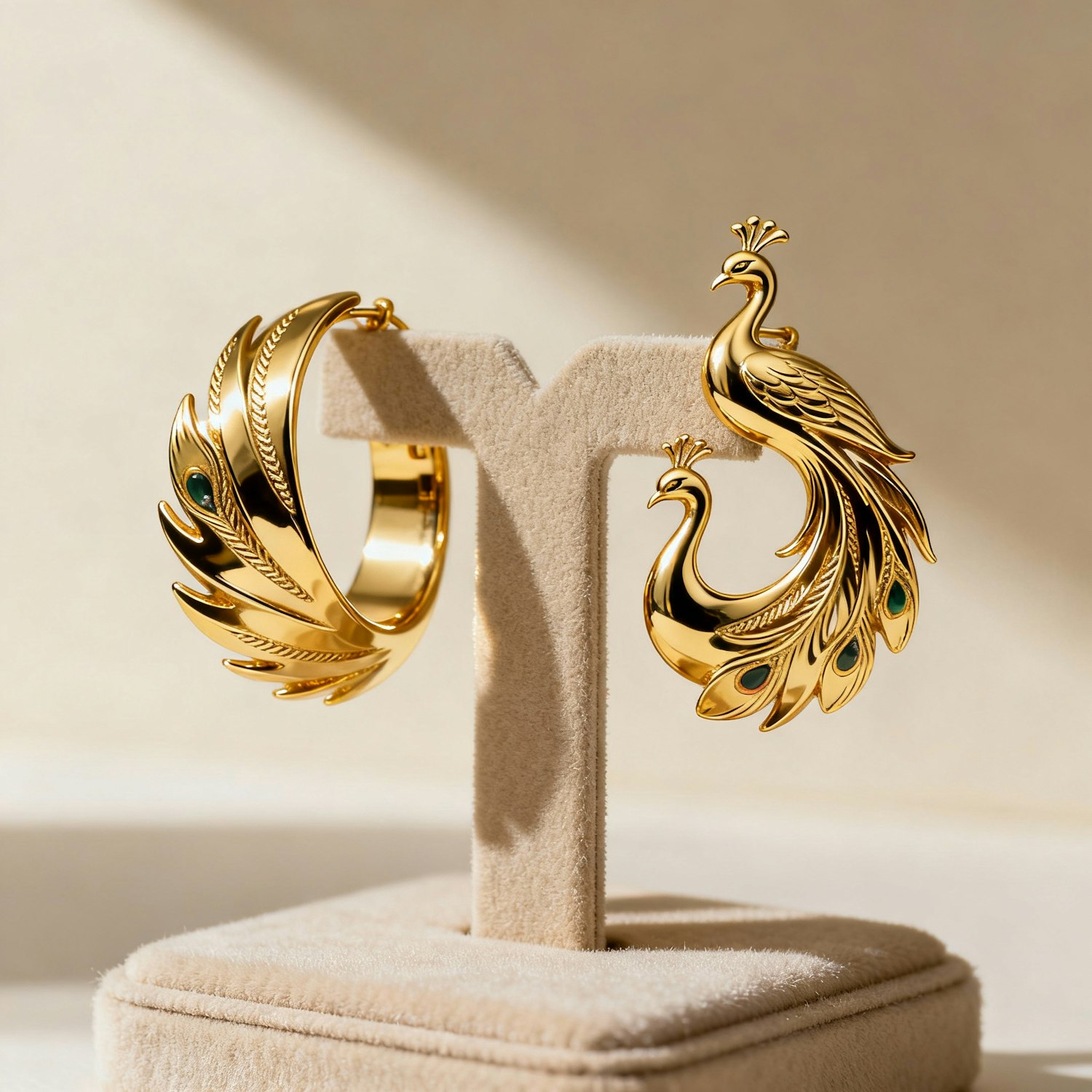 Elegant gold earrings with peacock designs and green gemstone accents, displayed on a beige velvet stand in soft lighting.