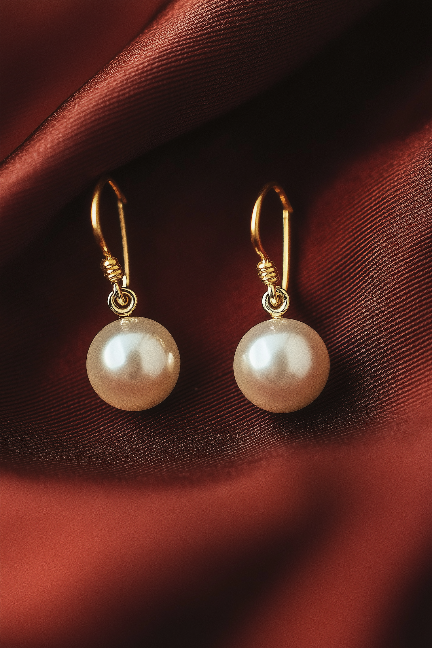 Elegant pearl drop earrings with gold hooks on a rich reddish-brown fabric background, showcasing timeless sophistication.