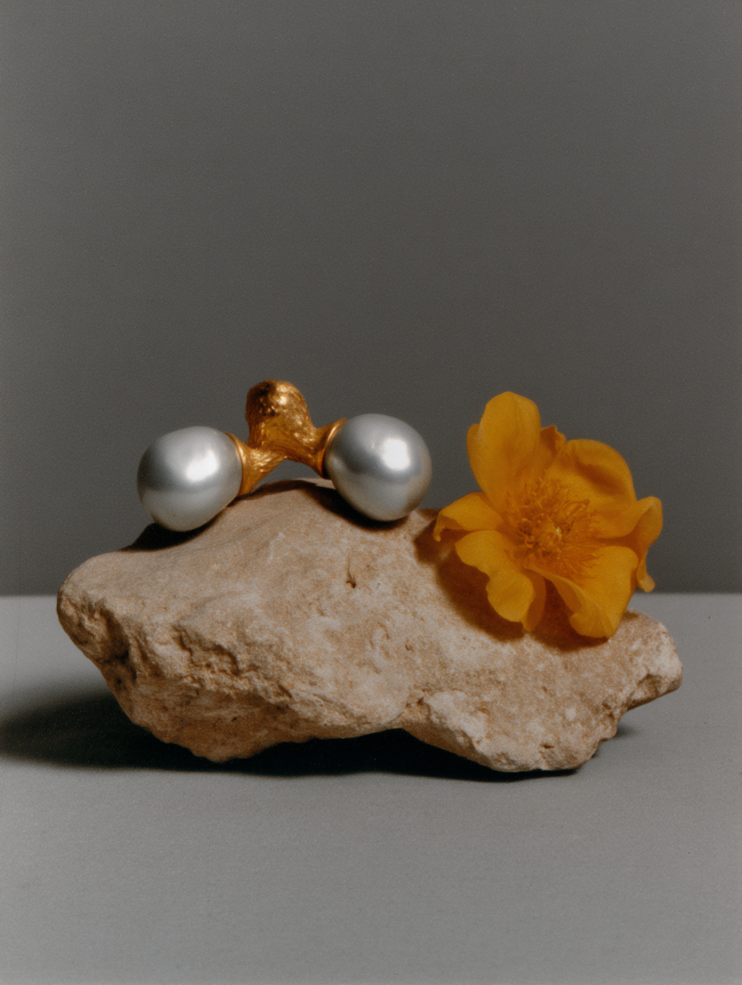 Elegant gold ring with pearls on a beige rock, paired with a vibrant yellow flower against a muted gray background.