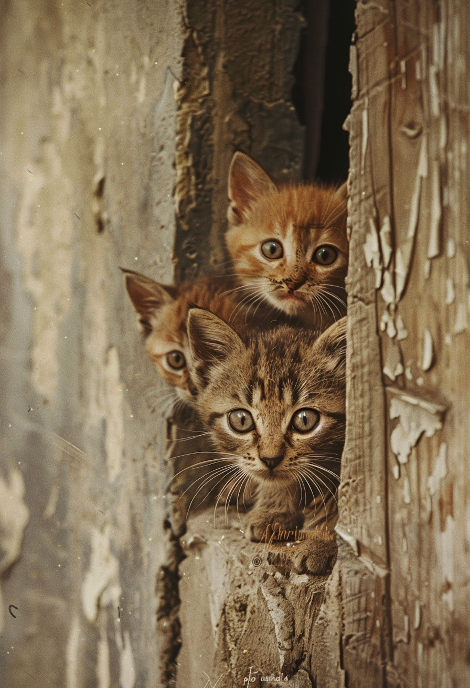 Three curious kittens peek from behind a rustic wooden surface, their green eyes wide with intrigue against a textured, peeling wall.
