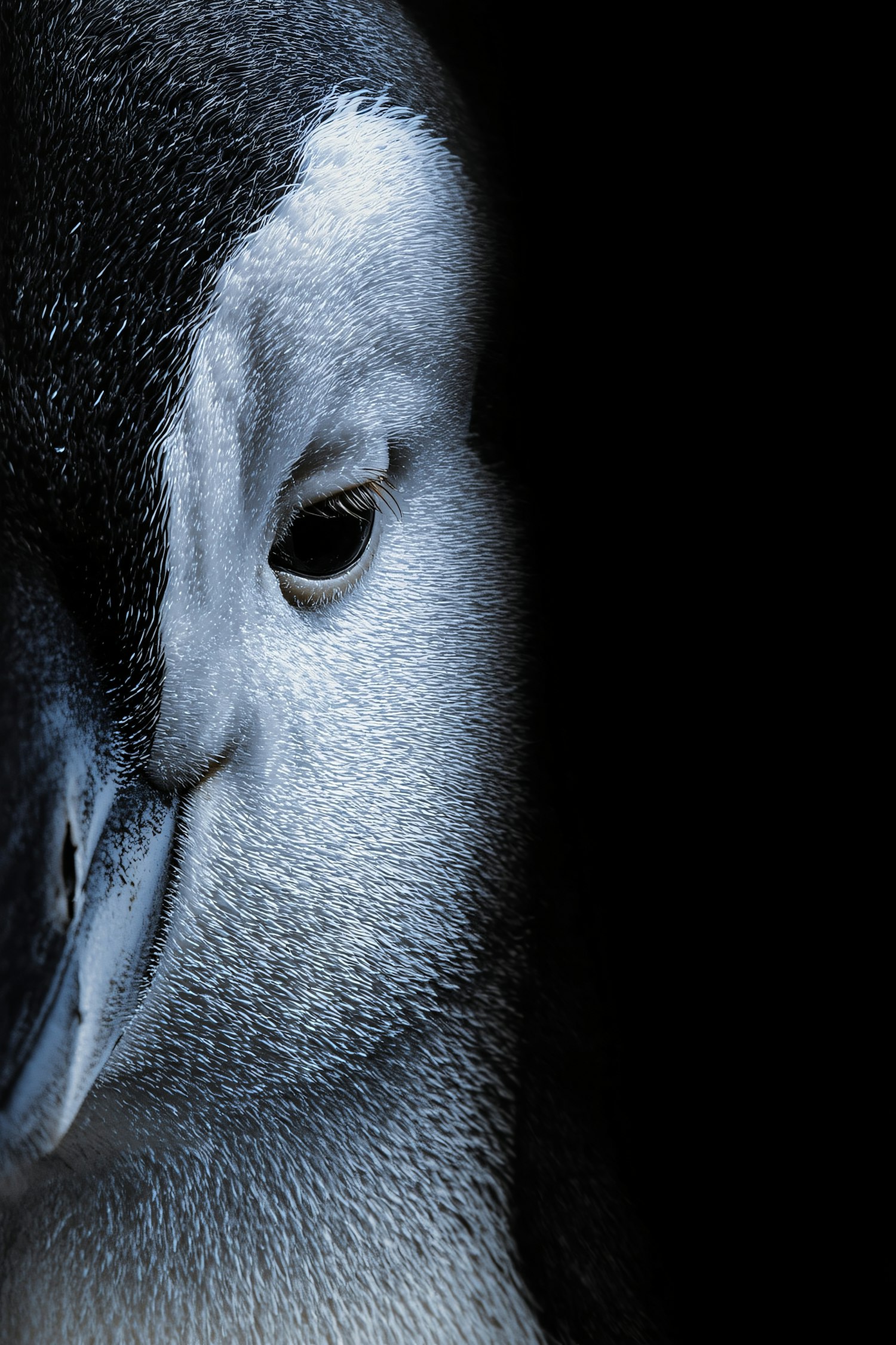 Close-up of a penguin's face with detailed feathers and a dramatic black background, highlighting its eye and serene expression.