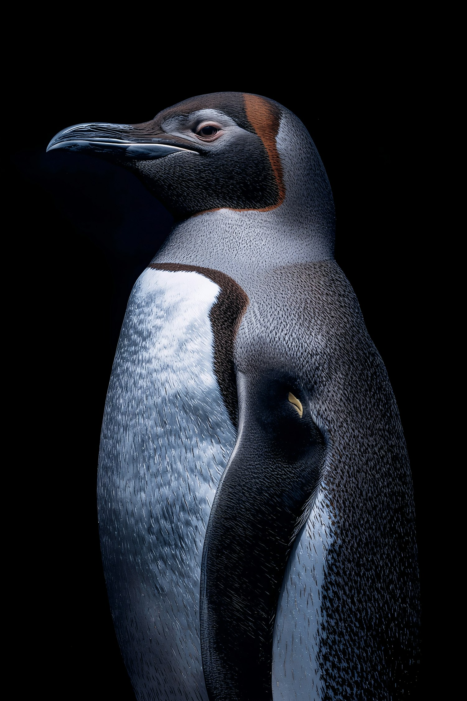 A stunning close-up of a penguin with detailed plumage and a striking orange stripe, set against a black background for dramatic effect.