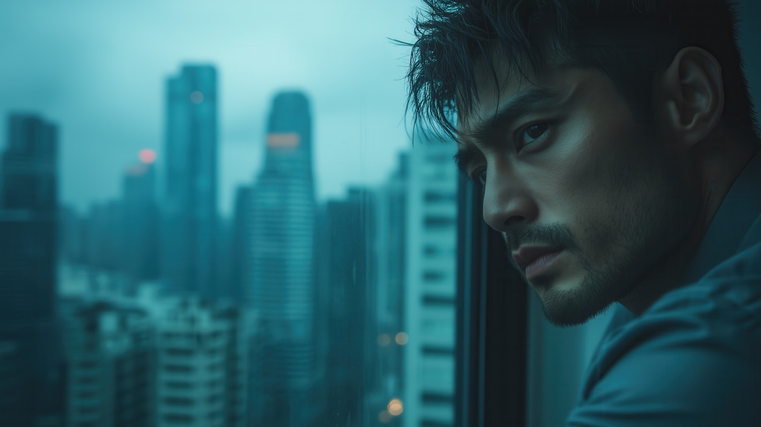 A pensive man with stubble gazes out a window, with a moody cityscape in the background. Cool blue tones set a reflective mood.